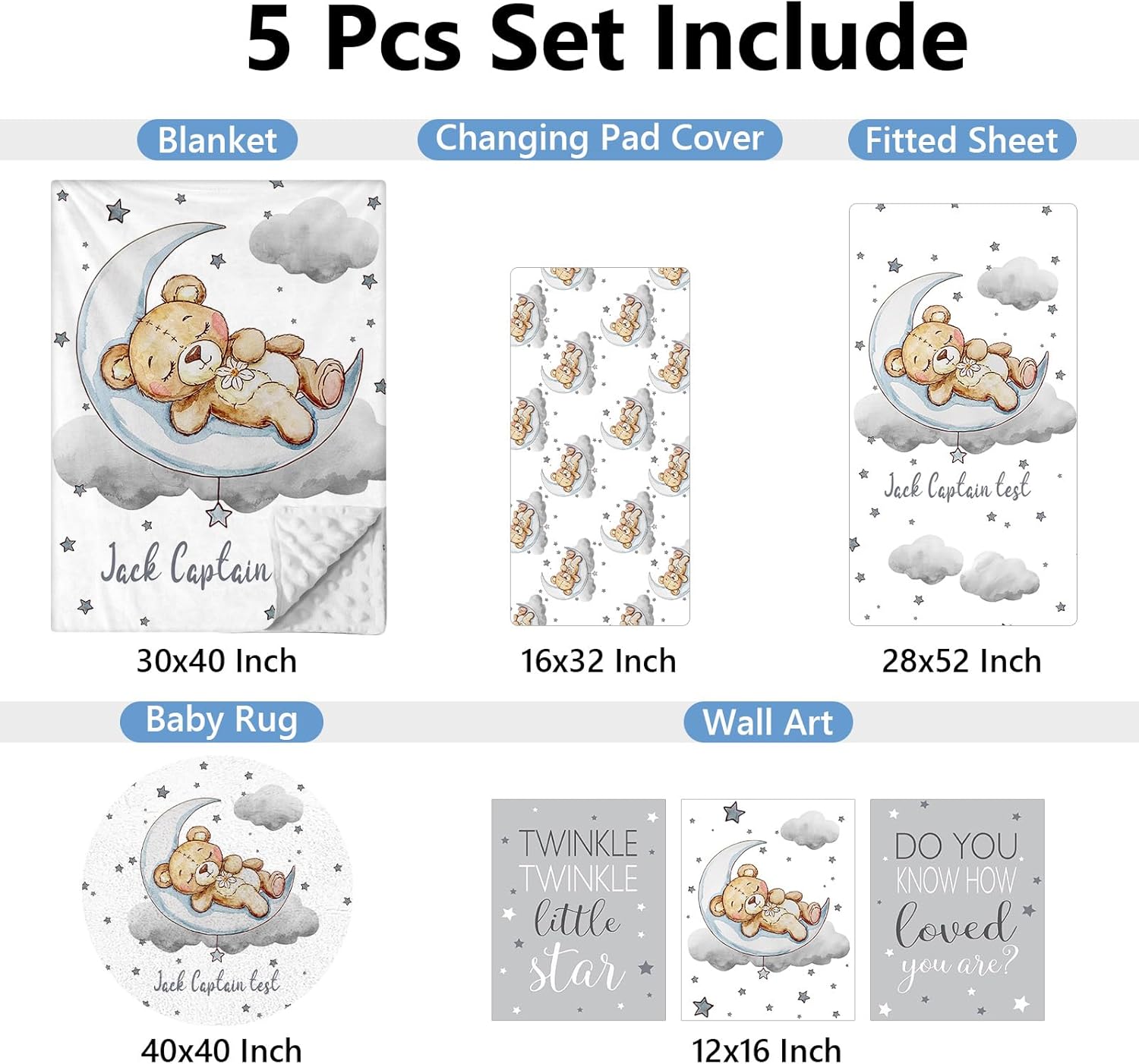 Personalized Crib Set, 5 Pcs Custom Baby Bedding with Name, Double Layer Nursery Bedding for Boy Girl, Soft Moon Bear Bedding Set, Gifts for Toddler, Infant, New Parents