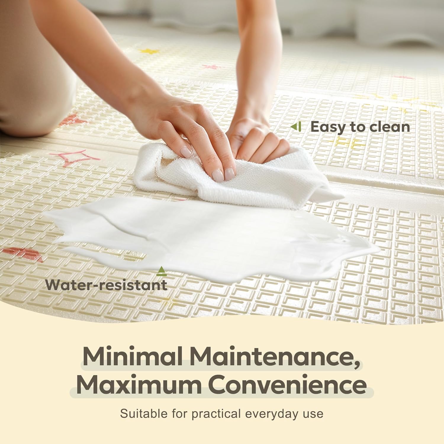 - EASY TO CLEAN & FOLD: Enjoy effortless clean-ups with our waterproof foam play mat that resists spills and stains. A simple wipe with a damp cloth or towel keeps it pristine and ready for play. Its foldable design allows you to quickly fold it into a compact size, while the handy carry bag ensures easy storage and portability, making it ideal for on-the-go families