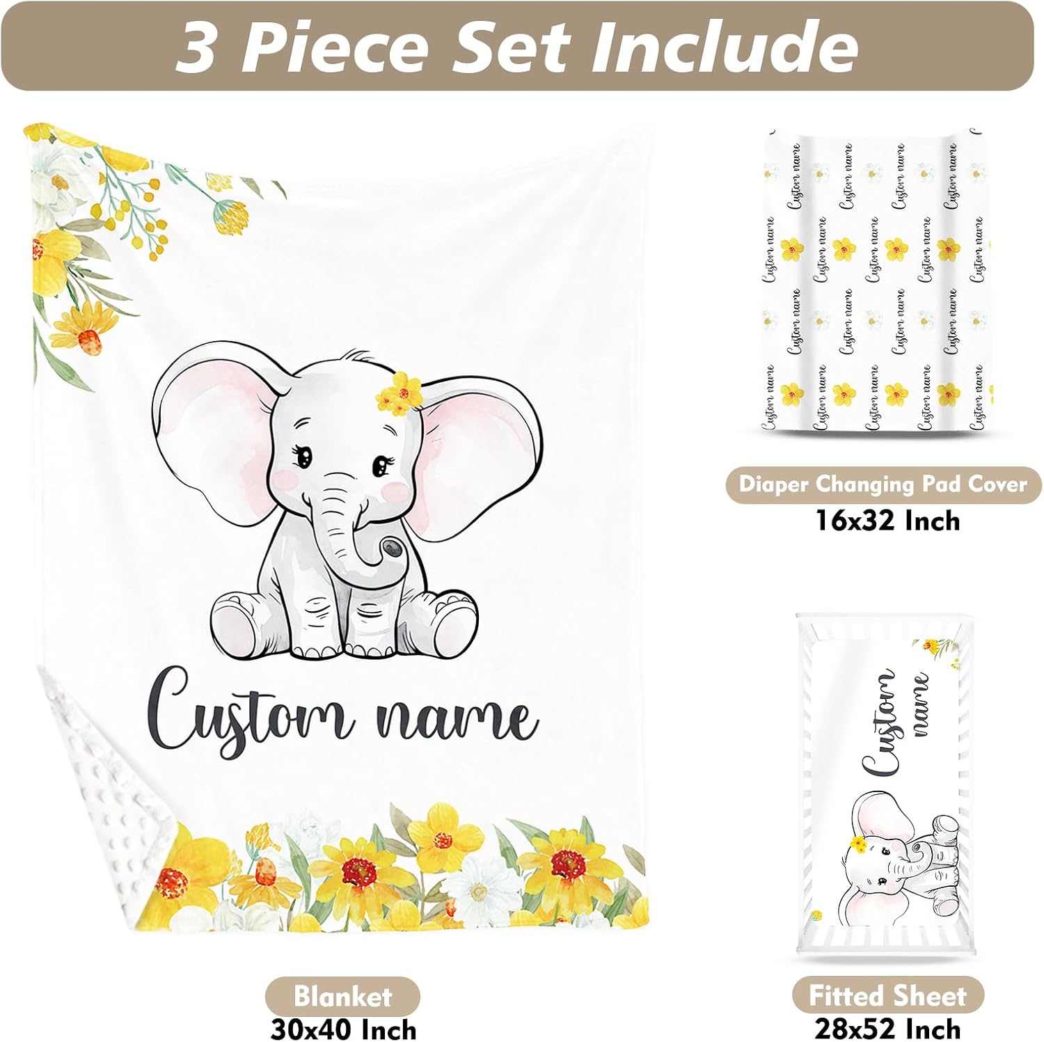 Custom Name Crib Bedding Set - Elephant Pattern, Personalized Yellow Floral Nursery Bedding 3-Piece Set– Soft Blanket, Fitted Sheet, Changing Pad Cover – for Newborns Girls Nursery Gifts