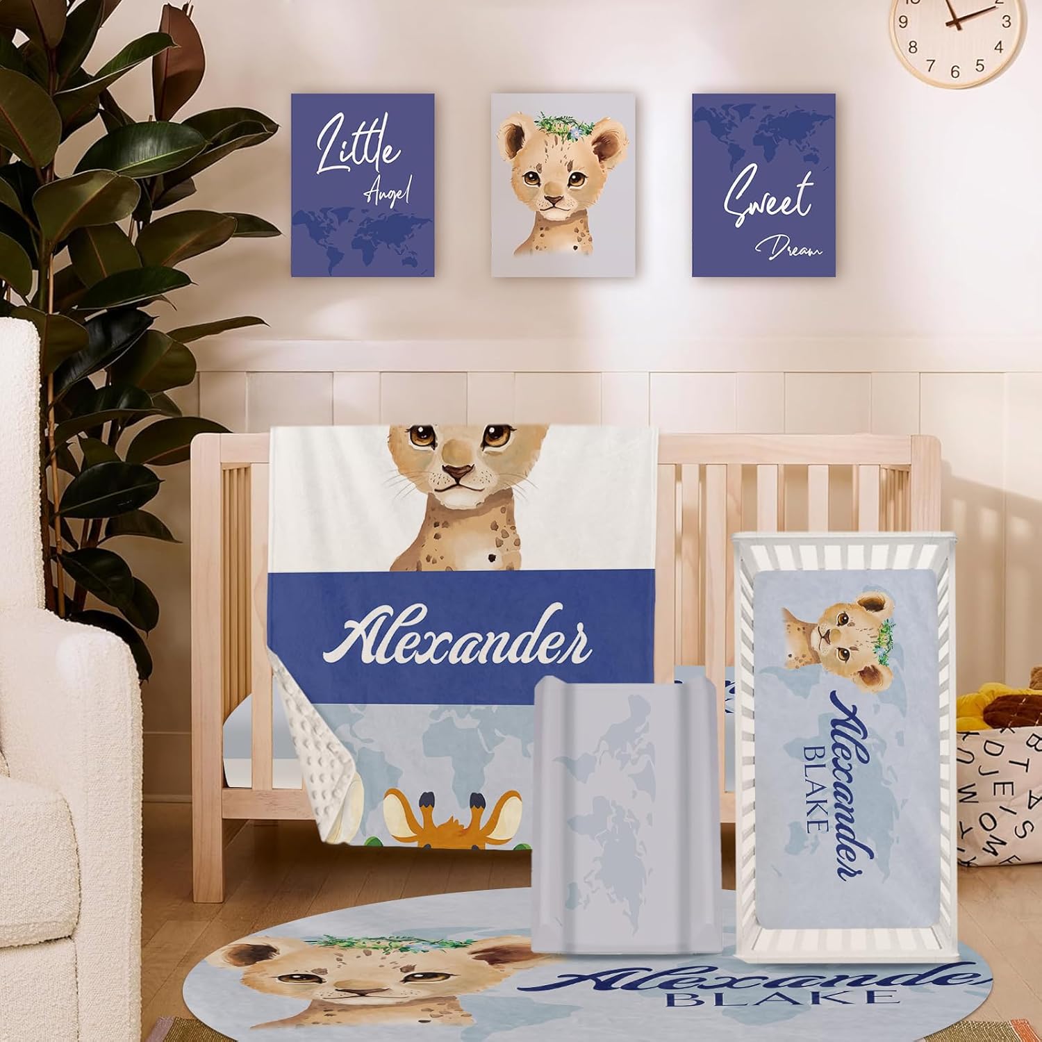Personalized Baby Crib Bedding Set for Baby Boys Girls, Blue Leopard Pattern Custom Name Baby Crib Sets 5-Pcs, Toddler Double Layer Blanket Fitted Sheets Changing Pad Cover Rug Wall Art Set