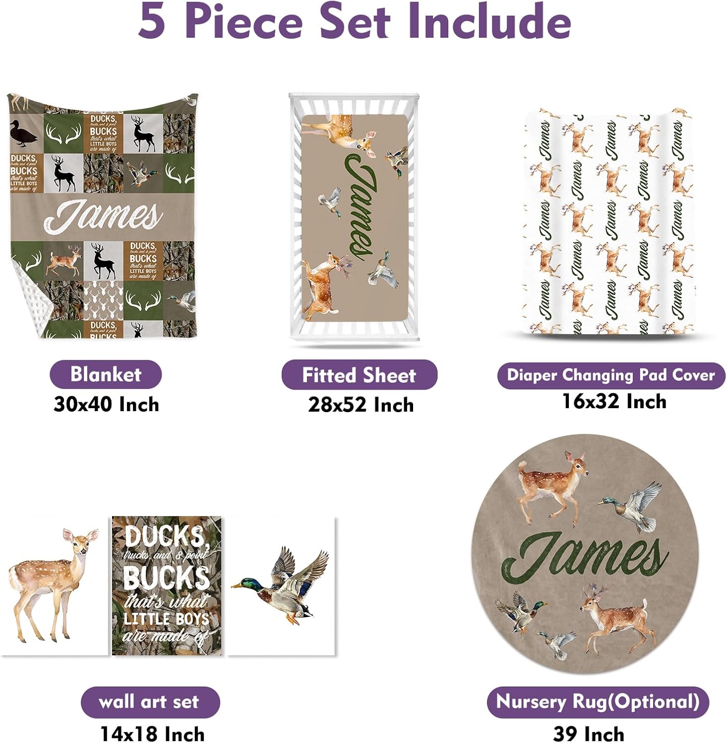 - Included Components : Changing Pad Cover, Double Layer Blanket, Fitted Sheet, Round Rug, Wall Art