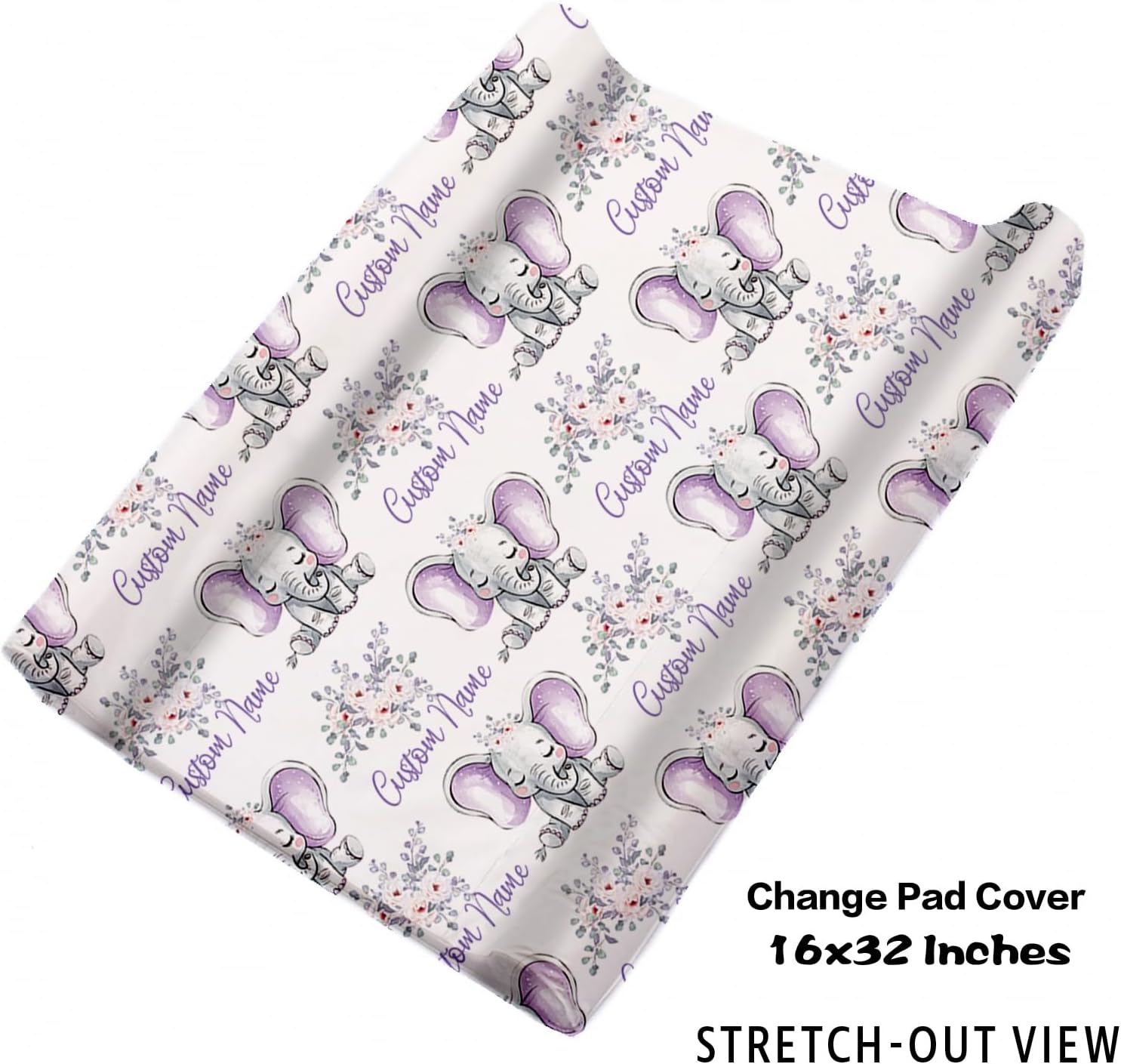 Personalized Baby Crib Bedding Set for Baby Girls, Light Purple Elephant Pattern Custom Name Baby Crib Sets 5-Pcs, Toddler Double Layer Blanket Fitted Sheets Changing Pad Cover Rug Wall Art Set