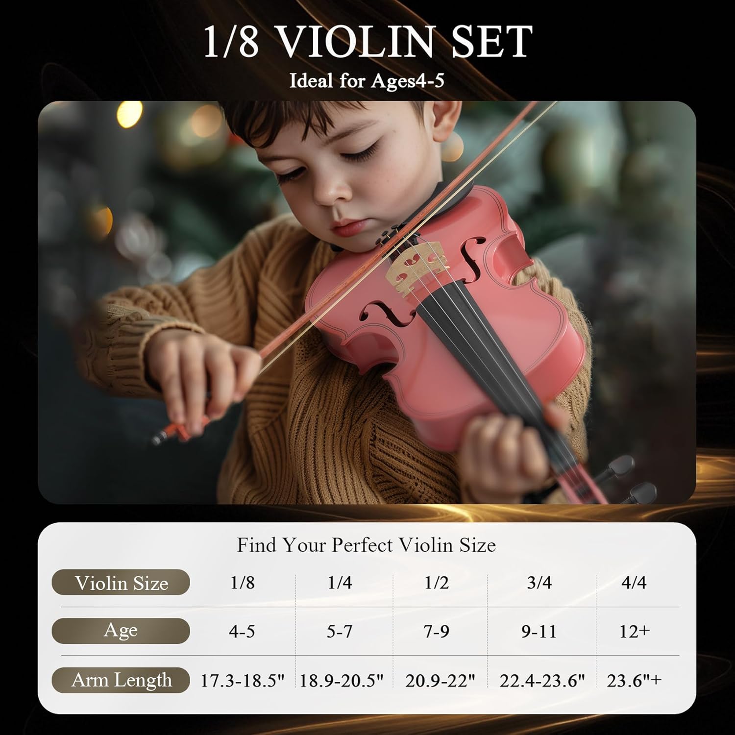 1/8 Beginner Violin Kit, Complete Violin Set with Case, Bow, Rosin,Pink