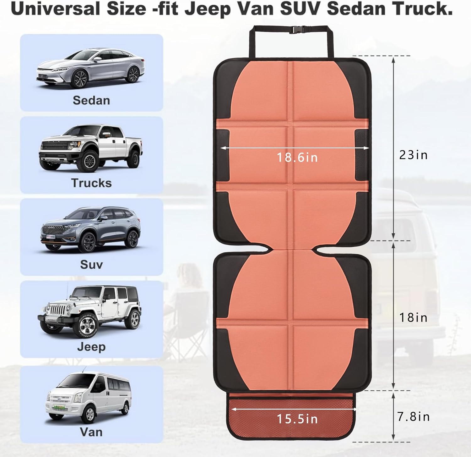 - The whole dimension of the auto seat protector carseat is 17.9 x 46.45 inch, the seat:17.9 x 16.9 inch, the back: 17.9 x 21.6 inch, and the mesh pocket: 12.9 x 6.8 inch. Universal fit Jeep Van SUV Truck.