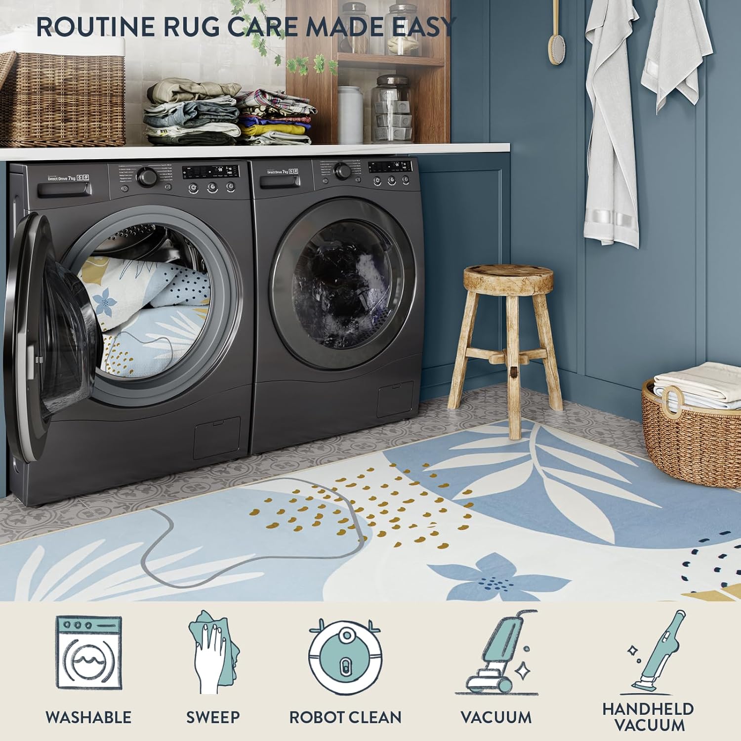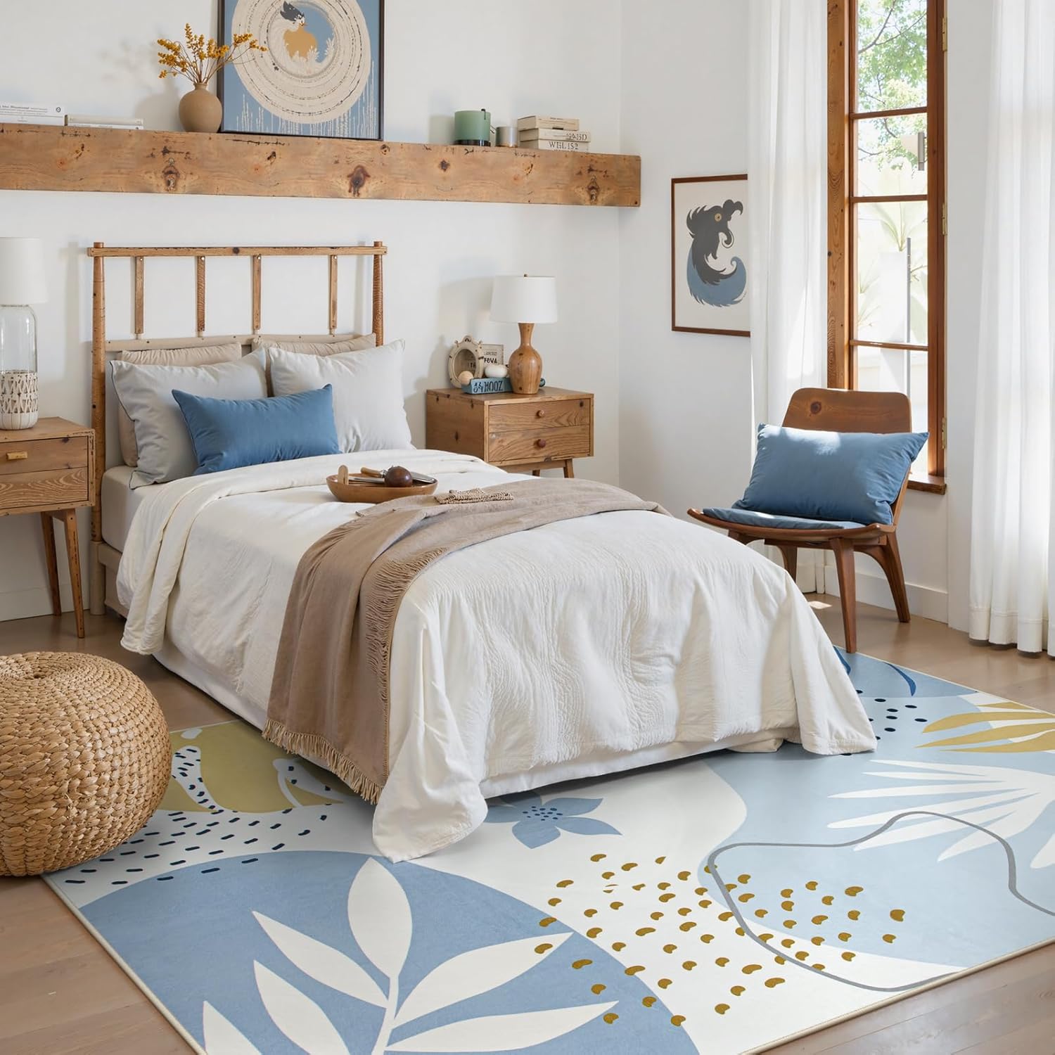 Lahome Boho Machine Washable 6x9 Area Rug for Living Room - Non-Slip Ultra-Thin Soft Bedroom Carpet, Botanical Print Indoor Rugs for Dining Room Classroom Nursery Office, Blue