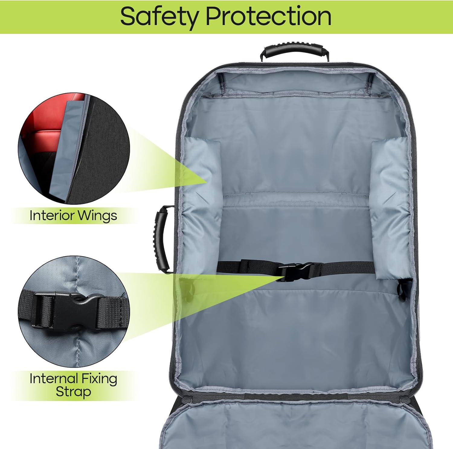 - Comfortable & Ergonomic: Padded interior wings and an internal fixing strap securely hold the car seat in place. Adjustable padded backpack straps and a waist strap ensure maximum comfort during travel, even for extended periods.