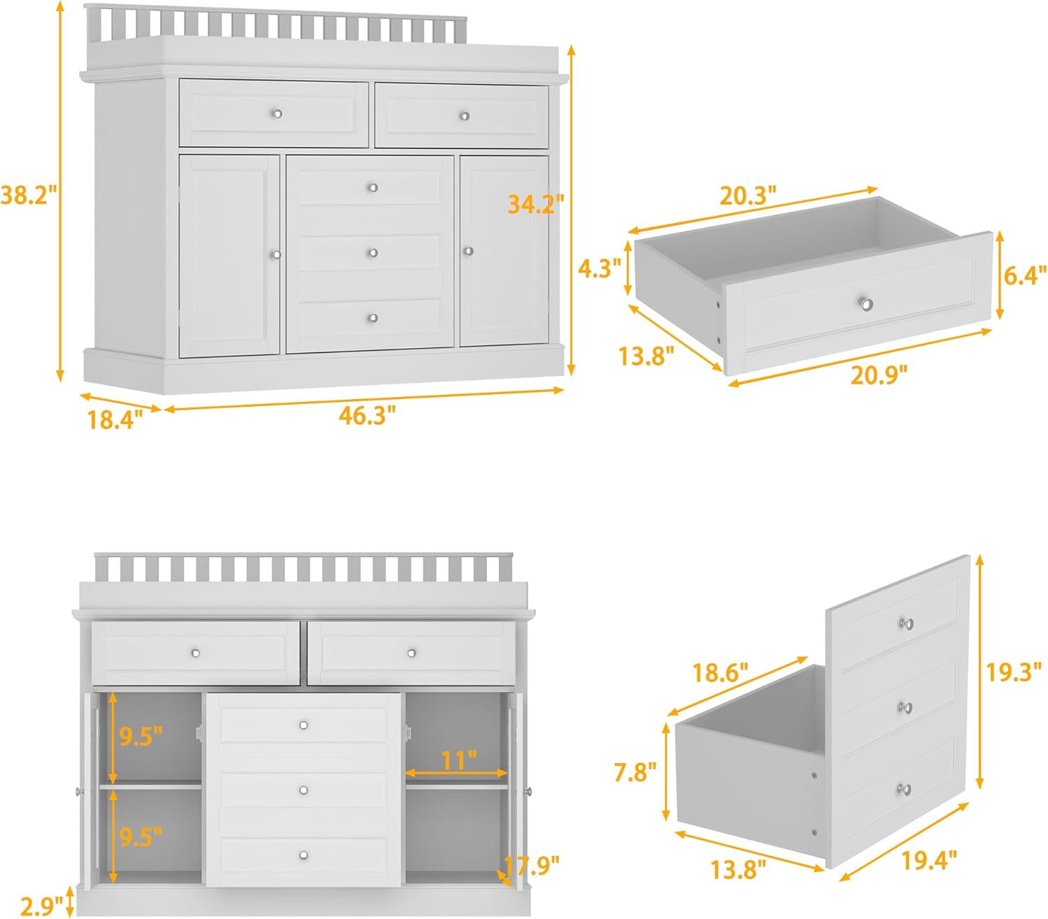 - Dresser with Changing Table - Baby dresser for nursery assembled overall dimension 46.3"W x 18.4"D x 38.2" H. Top of the dresser chest provides an appropriate height to place decor stuffs. The top guard is a detachable design, you can keep or remove it.