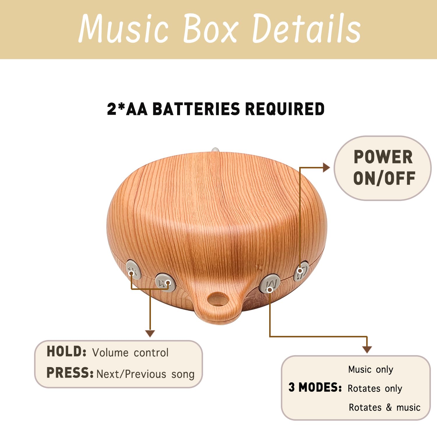 - 【About Music Box】This music box is made of non-toxic, durable ABS material for baby's safety. It offers 12 different lullabies, creating a harmonious and relaxing atmosphere to help babies unwind quickly. Equipped with four buttons – power, M, and two volume buttons. The M button switches modes. Press and hold volume buttons to adjust volume or short press to change songs. Volume is freely adjustable. Three modes available: rotation only, music only, and rotation with music. Automatically shuts off after 30 minutes to save power. Requires 2 AA batteries (not included).