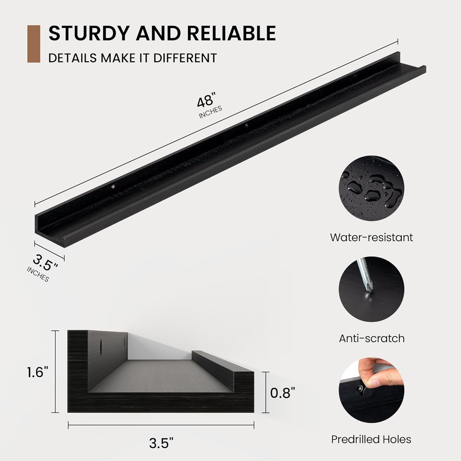 Picture Ledge Shelf, Solid Pine Wood Floating Shelves Set of 2, 48 Inches Nursery Book Shelves for Toys Storage, Kids Bookshelf Wall Mounted for Living Room Bedroom Decor Books Photo Frames, Black