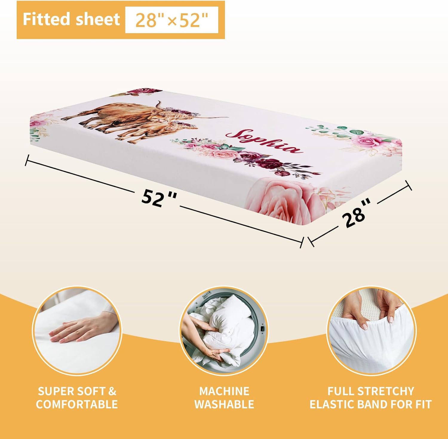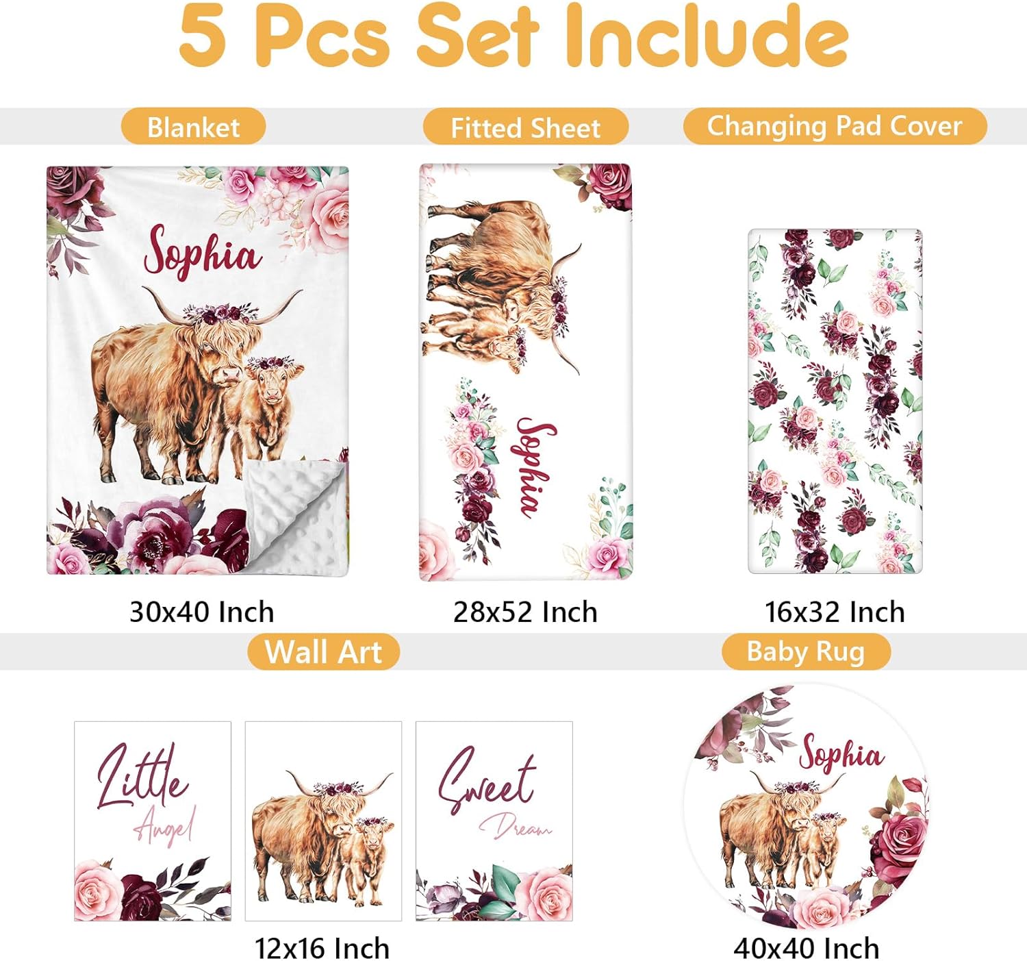 Custom Baby Crib Bedding Set, 5 Pcs Personalized Name Baby Crib Sets for Infant Toddler, Purple Highland Cow Nursery Bedding Set for Baby Girls, Double Layer Baby Bedding Sets Customized Gifts