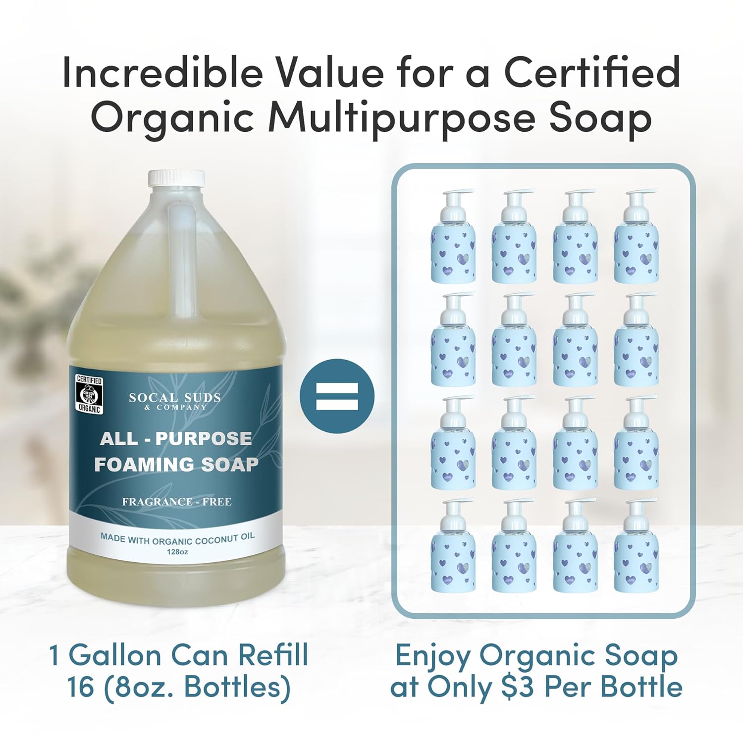 SoCal Suds & Company 128oz Certified Organic Foaming Hand & Body Wash - Gentle Natural Body,Baby & Face Wash for Sensitive Skin, Moisturizing All-Purpose Foaming Soap & More - Fragrance Free