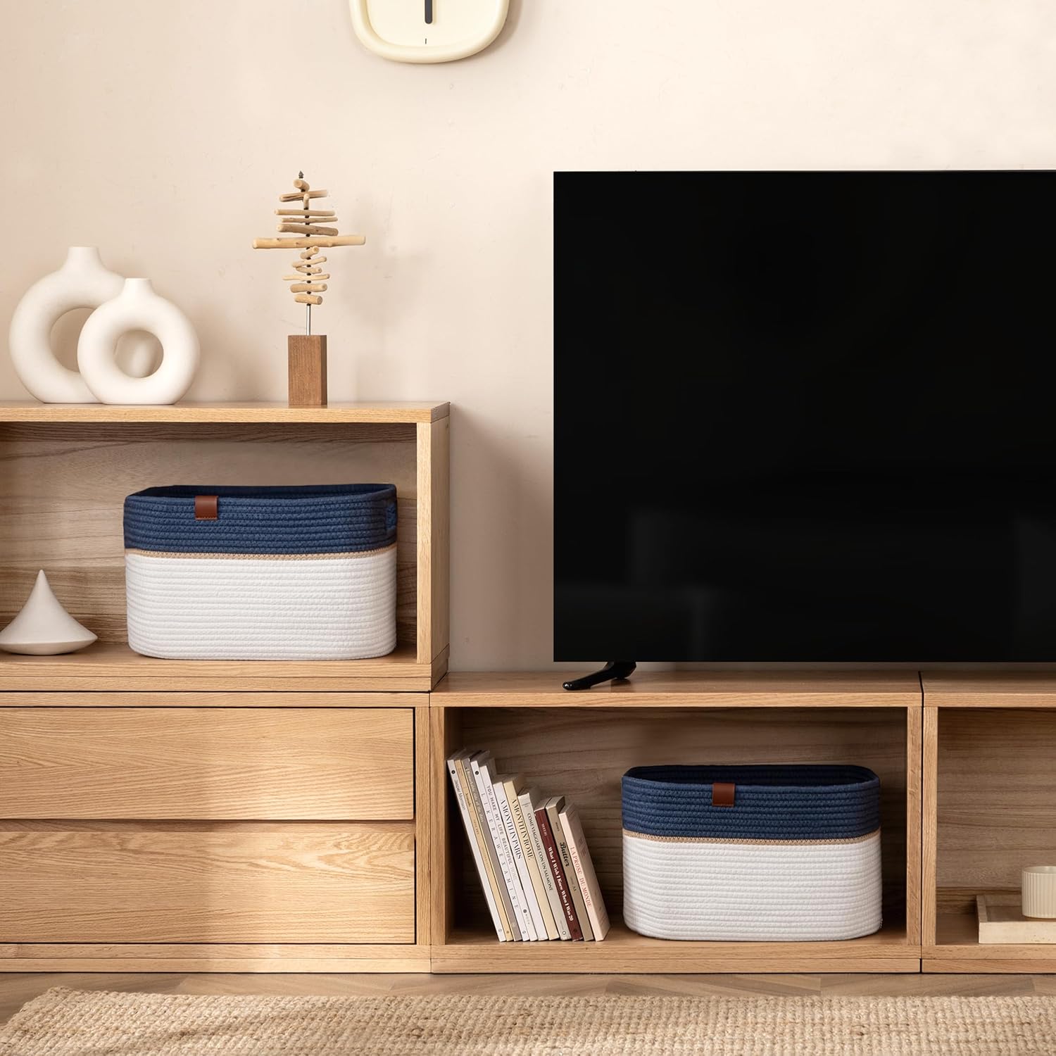 UBBCARE 2 Pack Baskets for Organizing, Woven Storage Baskets with Label for Toys and Towel, Rectangle Cotton Rope Basket with Handles, 15''L x10''W x9''H, Navy Blue&White