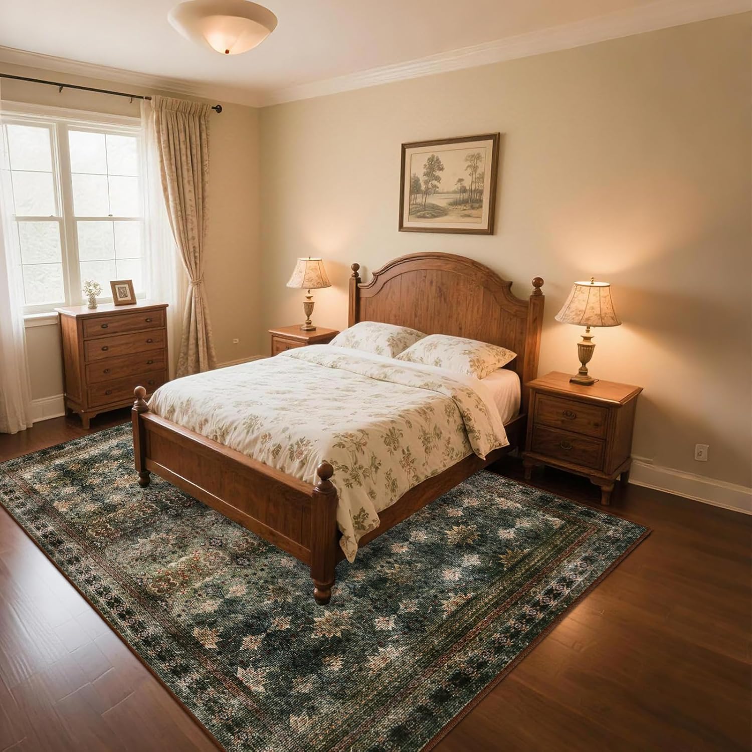 6x9 Washable Area Rug Non Slip, Thin Vintage Floral Living Room Rug Low Pile, Indoor Large Distressed Print Carpet for Bedroom, Dining Room, Farmhouse, Home Office, Dorm(Dark Green/Brown/Multi)