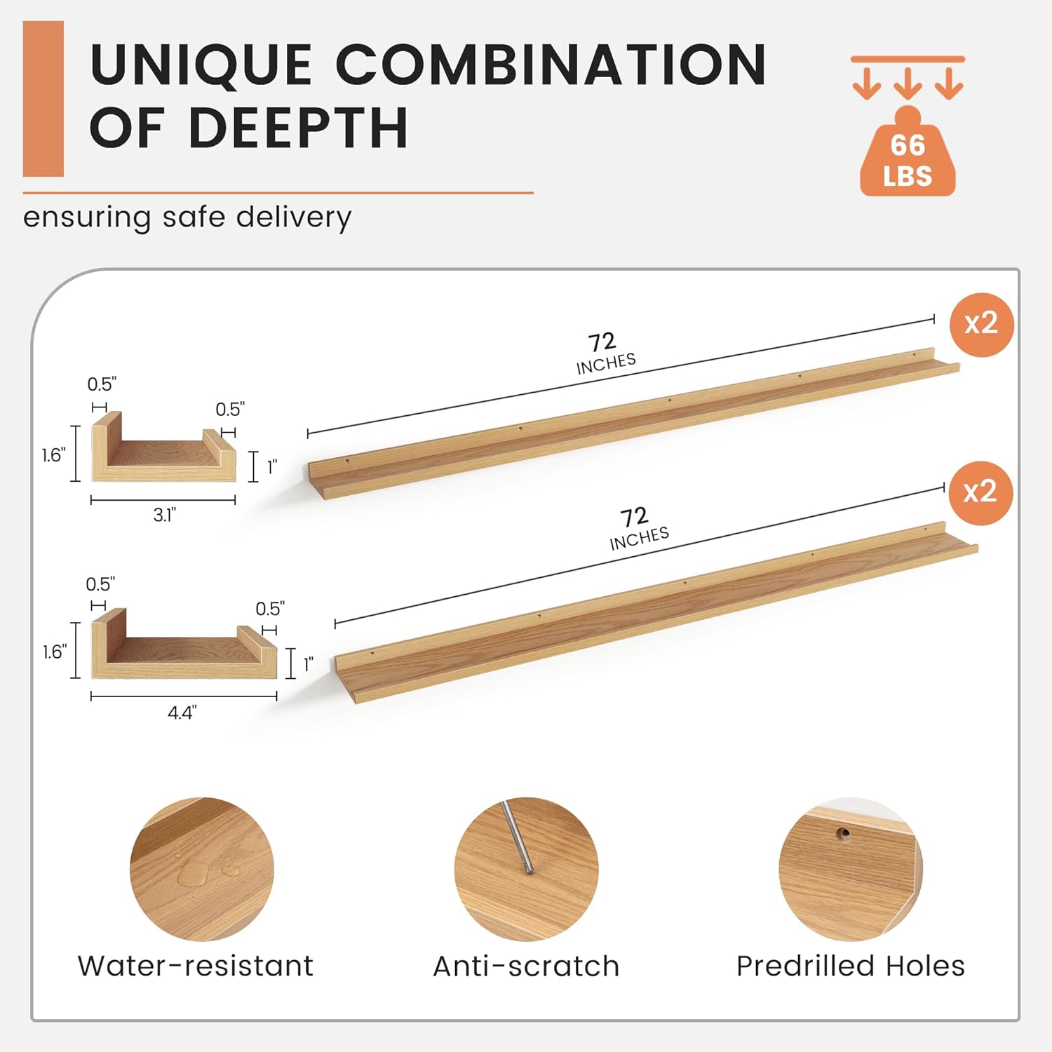 4-Pack 72 Inch Wall Mounted Floating Picture Ledge Shelves, Modern Oak Style, Perfect for Displaying Photos, Books, Collectibles, and More