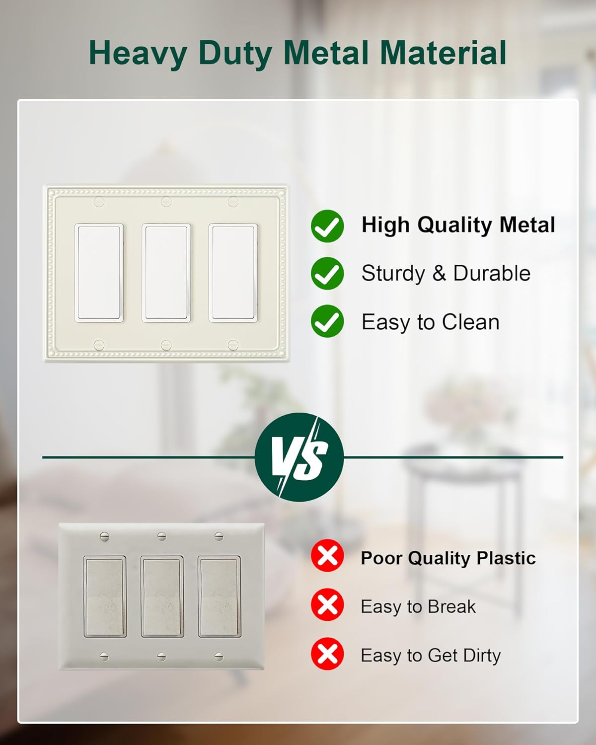 - Elegant Light Almond Finish - The tripple decorator outlet cover features a soothing light almond finish, not as dark or yellow as ivory, offering a warmer tone than stark white. This elegant finish adds a fresh appeal to your room and seamlessly blends with any interior style, enhancing the overall aesthetic of your home decor.