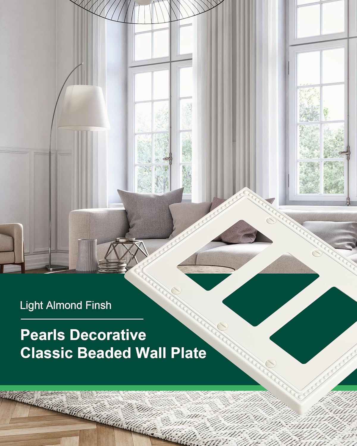 2-Pack Triple Decorator Outlet Cover Plate, Light Almond Pearls Decorative Switch Plates Covers, Metal Wall Plates for Electrical Outlets, Receptacle, GFCI Outlet, Dimmer Switch