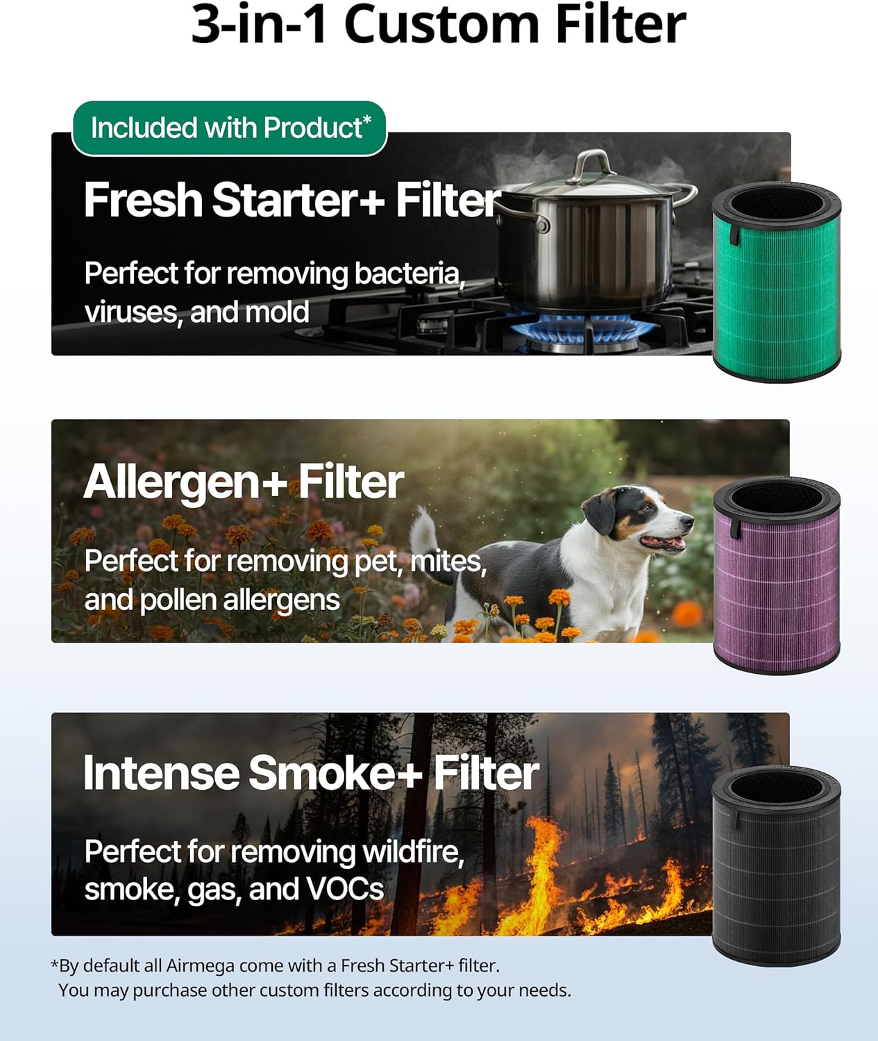 - Advanced 3-in-1 Filteration system combines a vacuumable pre-filter, activated carbon, and a True HEPA Filter effectively reduces up to 99.999% of particles down to 0.01 microns in the air, including pollen, pollutants and other allergens. It also reduces more than 99% of volatile organic compounds and reduces fumes such as NH3 and CH3CHO.