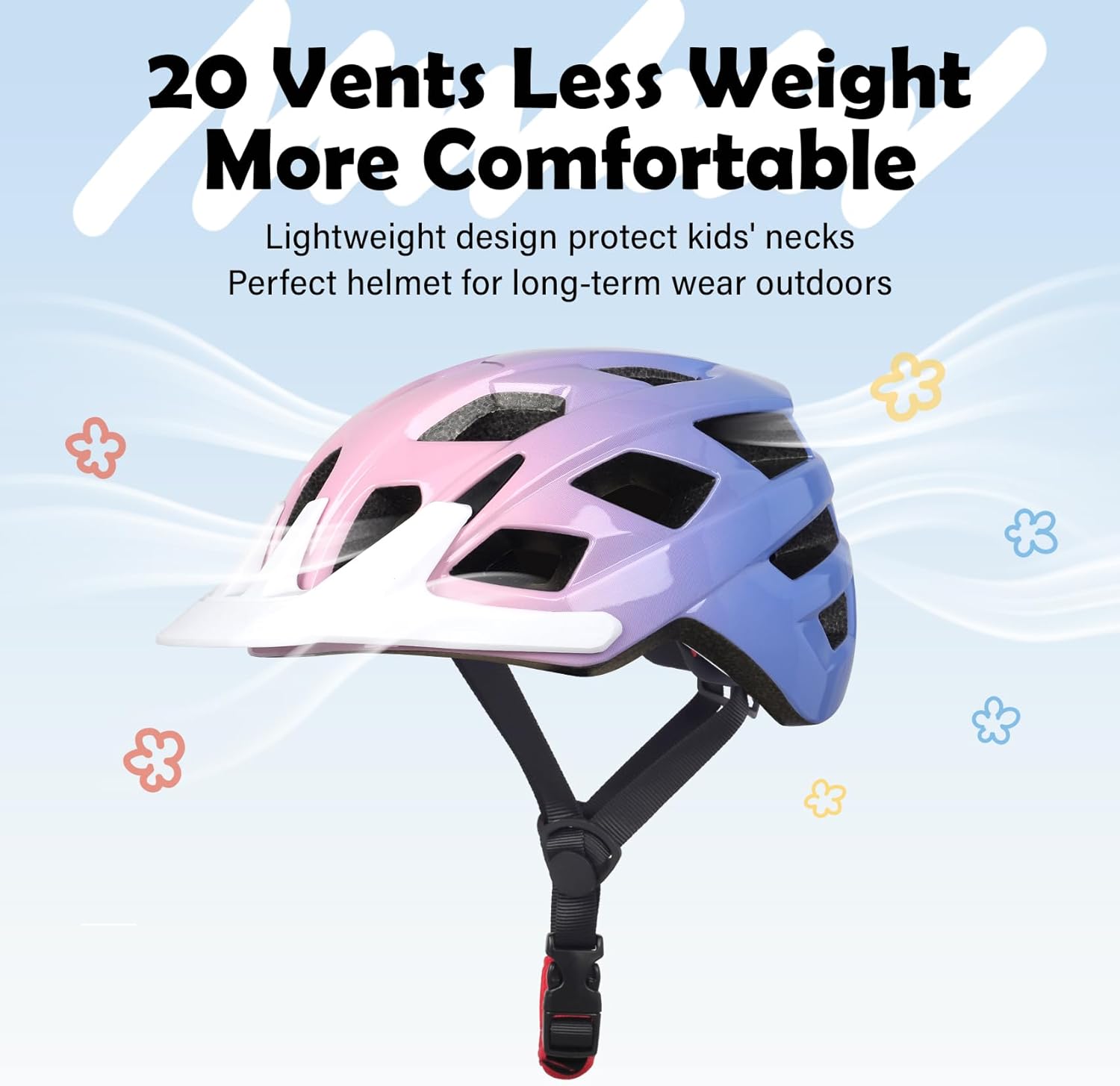 - Lightweight : Our kids bike helmet is ultra light just 255 g/0.55lb with 20 vents for less sweat and a more comfortable cycling even on hot summer days