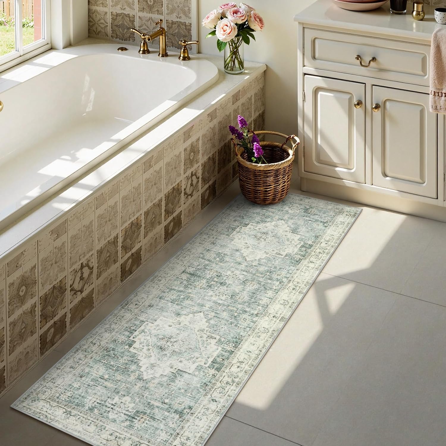 LIVEBOX Washable Rug 2x4 Kitchen Mats for Floor Entryway, Non Slip Front Door Mat for Bathroom Hallway, Boho Low-Pile Small Carpet Farmhouse Indoor Runner Rugs for Bath, Sage Green