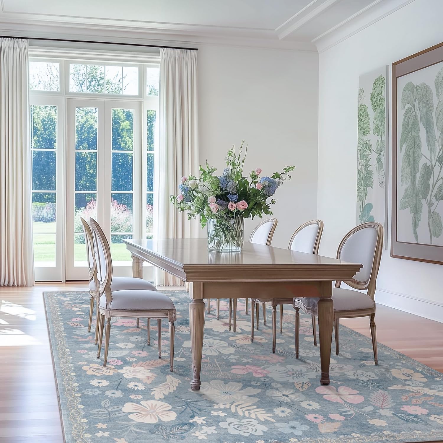 Blue 6x9 Area Rugs Machine Washable Low Pile Non Slip Stain Resistant for Living Room Big Boho Vintage Flower Pattern Carpet Rug Ultra-Thin for Bedroom Dining Room Kids Playroom