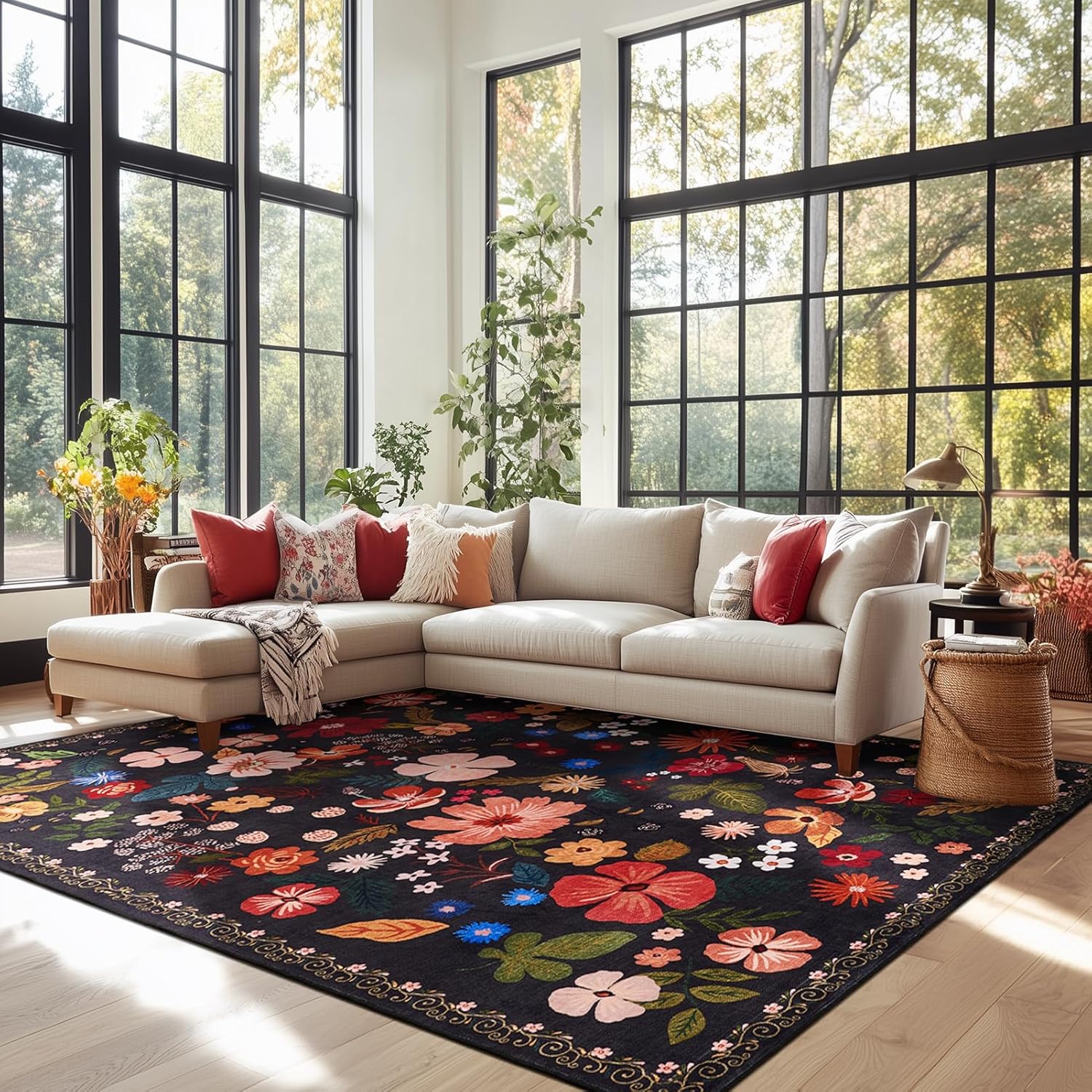 6x9 Living Room Rug Machine Washable Soft Faux Fur Low Pile Vintage Floral Modern Carpet Rugs Boho Non Slip Sound Absorbing Big Area Rugs for Bedroom Office Patio Dining Room Nursery Kids Room,Black