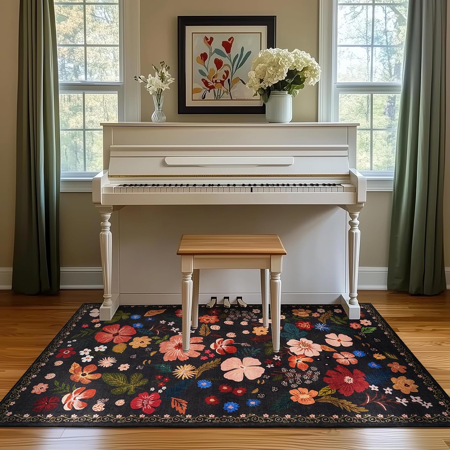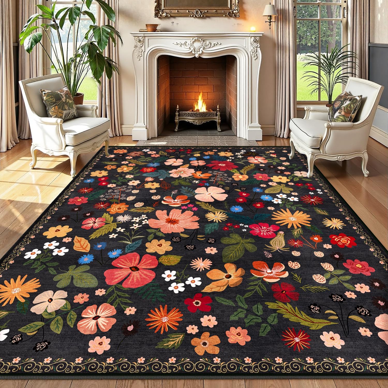 Black Area Rug 5x7 for Bedroom Washable Boho Farmhouse Floral Rugs for Living Room Vintage Aesthetic Stain Resistant Non-Slip Soft Low Pile Thin Floor Carpet for Living Room Dining Room Nursery
