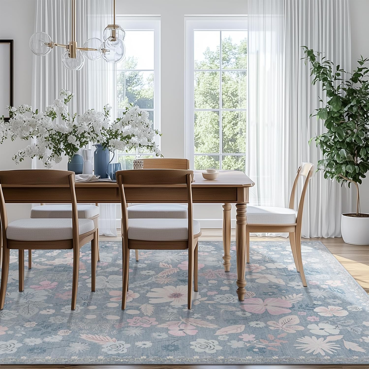 French Country 8x10 Area Rugs for Living Room Washable Blue Floral Stain Resistant Carpet Rug Soft Boho Vintage Garden Low Pile Non Slip Large Rug for Bedroom Dining Room Playroom Nursery,Daphne Blue