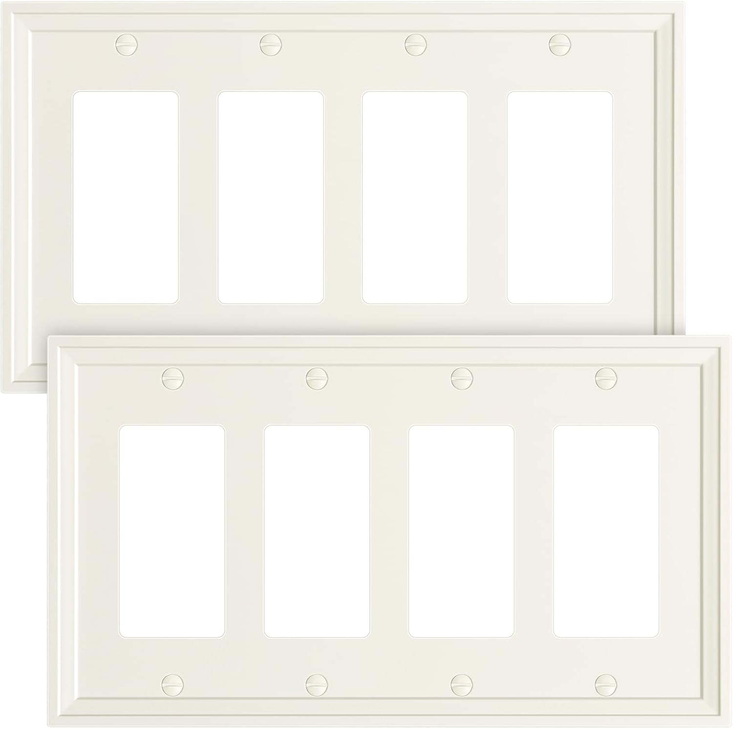 - Specification - Pack of 2 quad decorator wall plates, size at 8.35''W*4.92''H. Easy replacement of any wall plate with the same configuration, making it a convenient choice for remodeling or upgrading your home. Backed by a one-year warranty for your peace of mind and satisfaction.