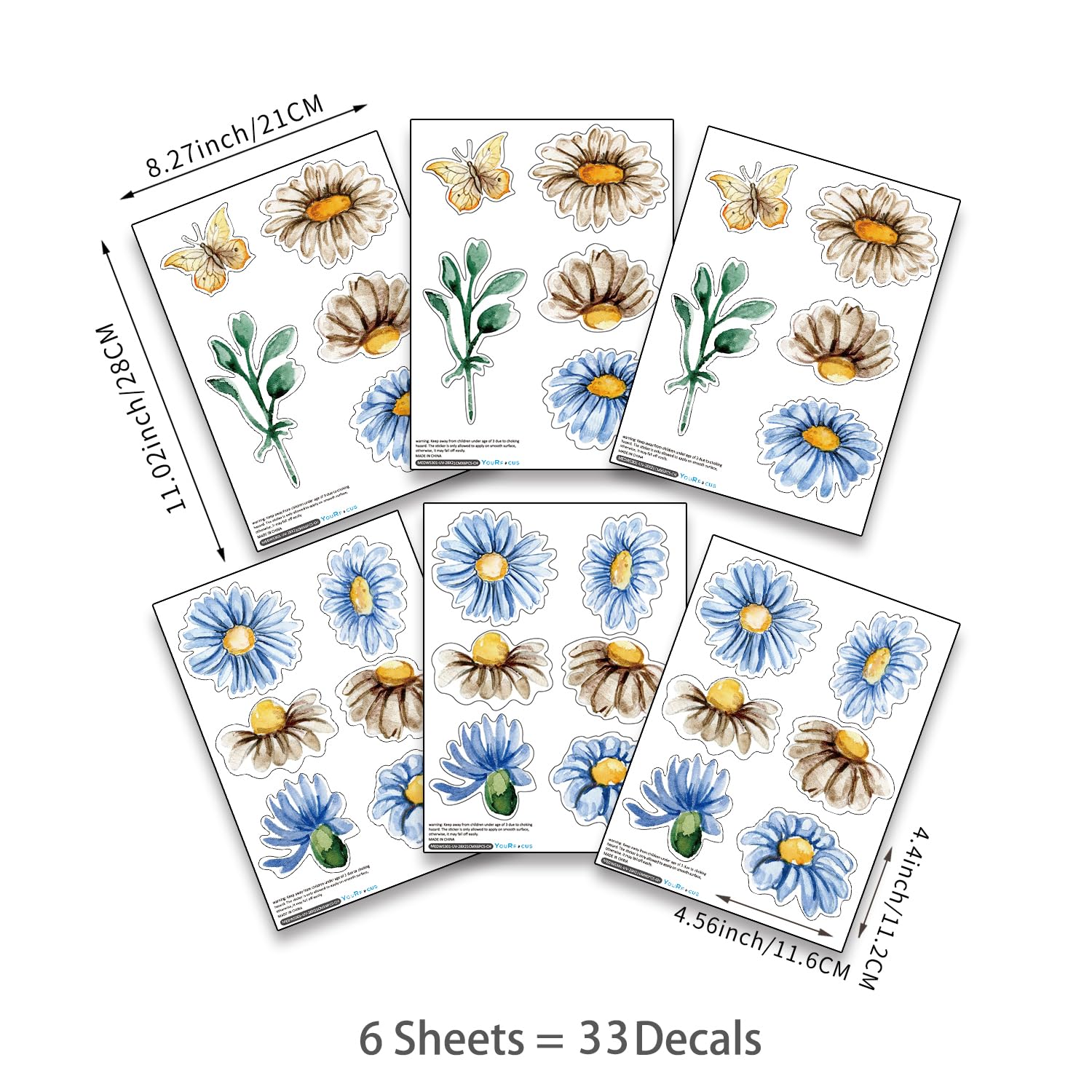 YouRfocus Blue Daisy Wall Decals | 33 PCS Boho Flower Stickers for Girls' Rooms, Playrooms, and Nurseries | Dual Layer Print for High Coverage | Removable Peel and Stick Wall Decor | 6 Sheets