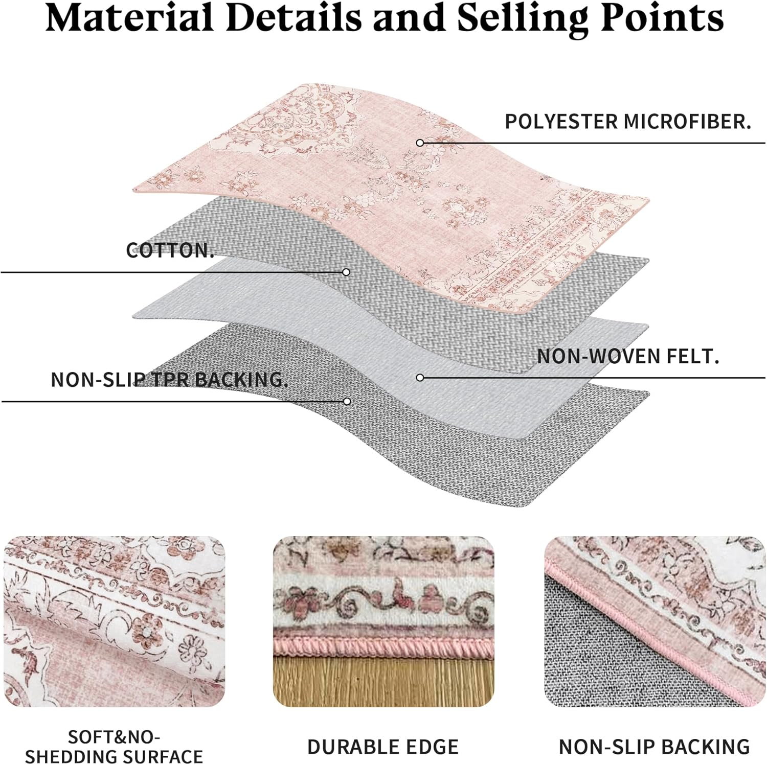 4x6 Area Rug Washable: Oriental Soft Area Rug for Living Room Bedroom No Shedding - Low Pile Thin Carpet Rug for Dining Room Non Slip - Boho Vintage Rug for Home Decor - Soft Pink
