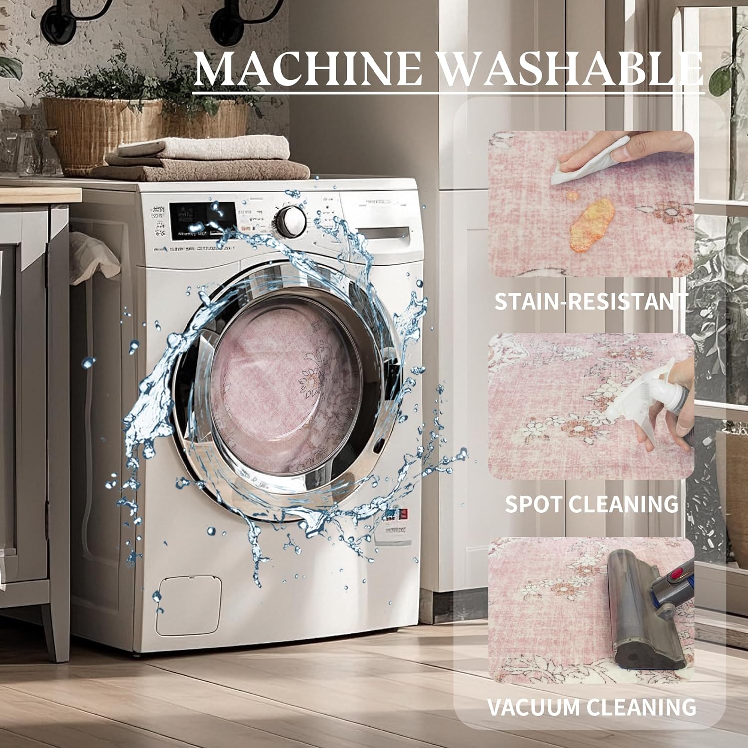 6x9 Area Rugs Washable: Oriental Soft Area Rug for Living Room Bedroom No Shedding - Low Pile Thin Carpet Rug for Dining Room Non Slip - Boho Vintage Rug for Home Decor - Soft Pink