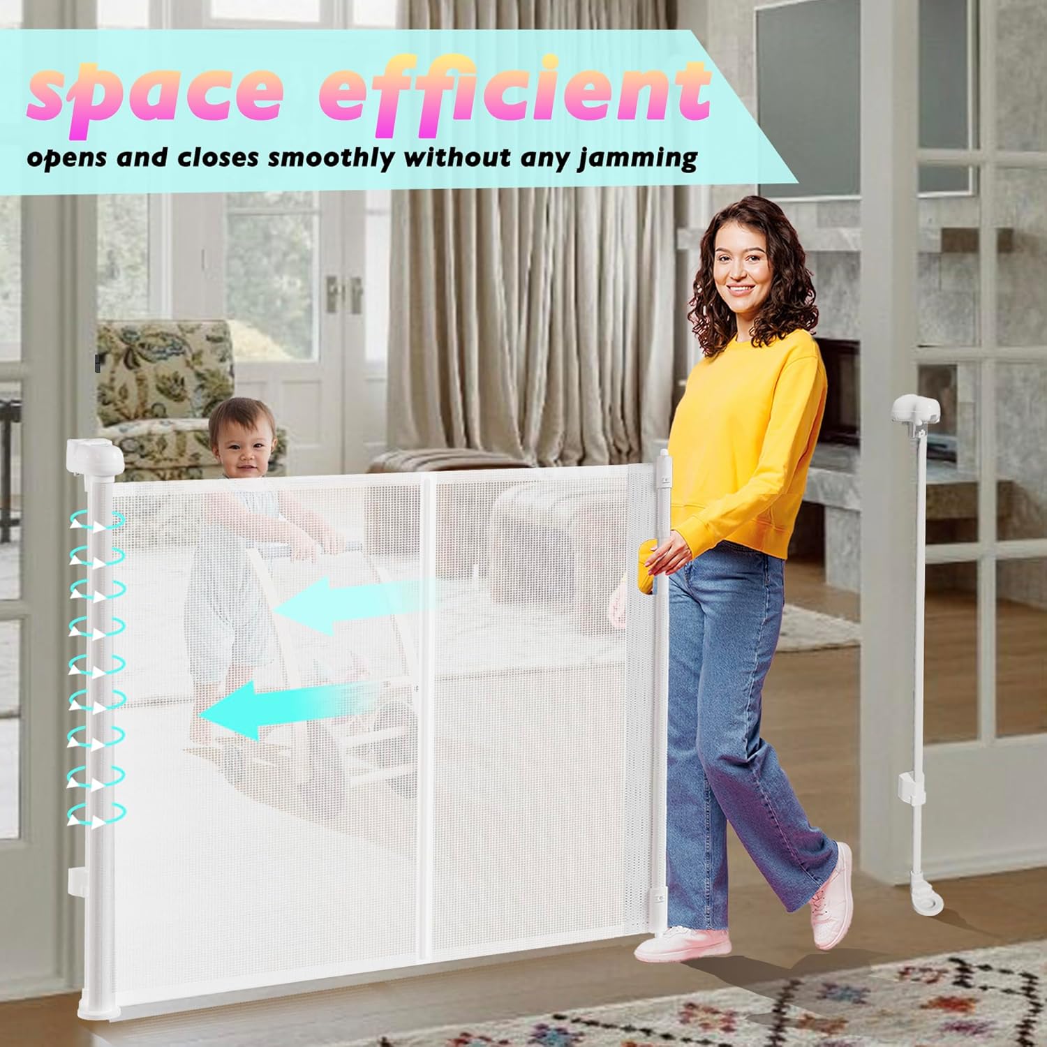 - Safety Double Lock Design - The retractable mesh gate features two locking mechanisms: a mesh lock that controls the mesh's extension and retraction, and a hidden gate lock for opening and closing the gate. Designed for adult convenience, it remains particularly challenging for children, effectively preventing them from opening the gate alone and accessing hazardous areas.
