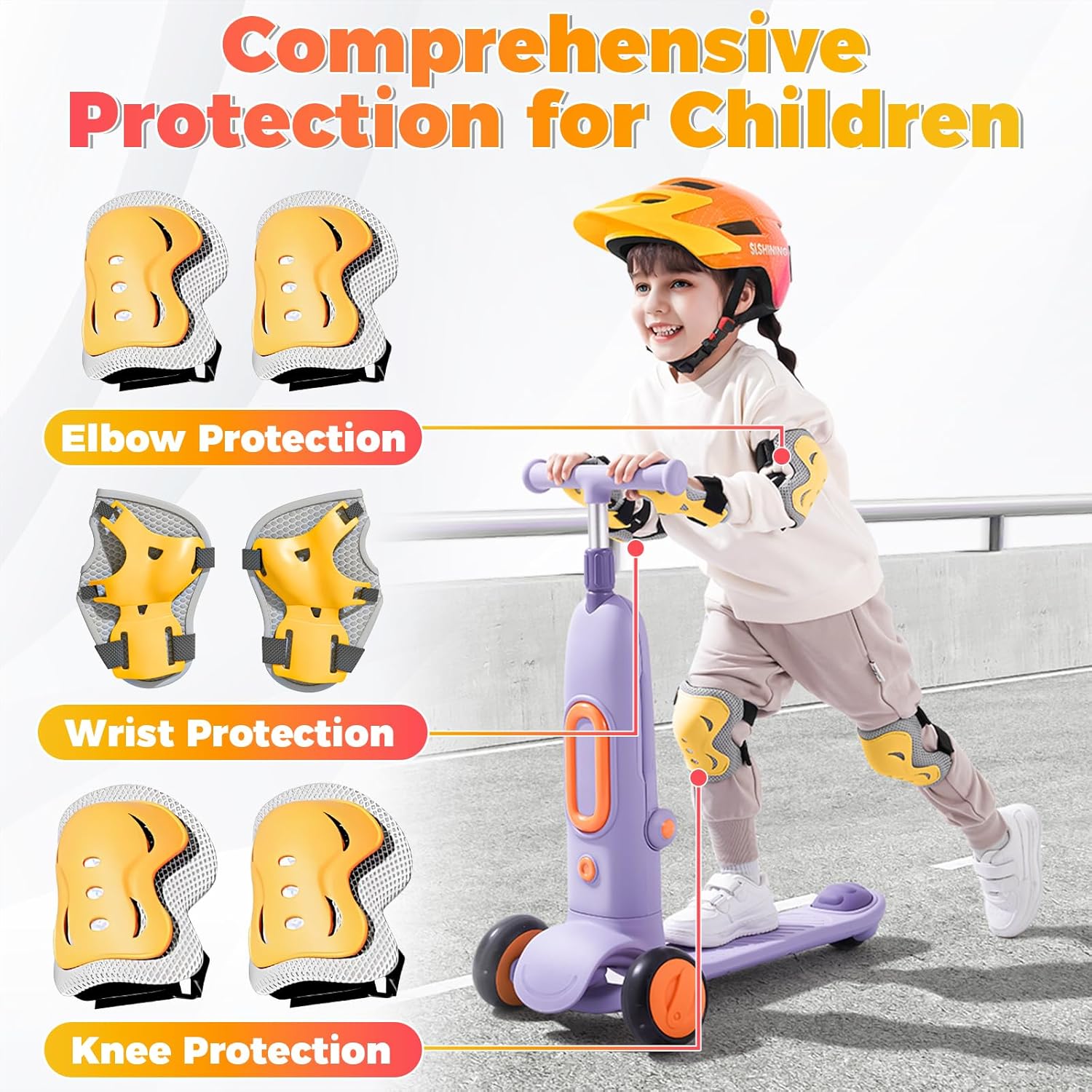 - 7 IN 1 CHILD PROTECTIVE GEAR: The package contains 1 storage bag, 1 kids helmet, 2 knee pads, 2 wrist guards and 2 elbow pads. The knee pads, elbow pads and wrist guards adopt three-layer thickened protective gear, which is more effective for comprehensive protection. It provides all protection elements for babies, toddlers, children and kids, allowing children to enjoy outdoor sports more
