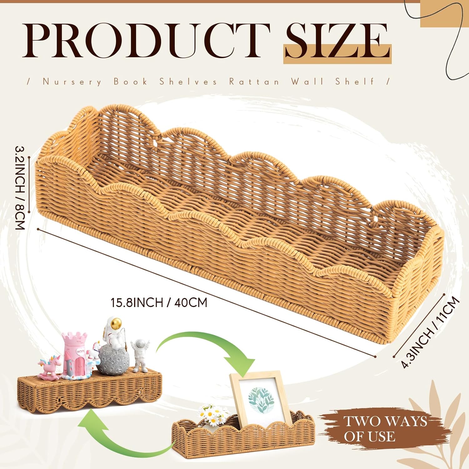 Pinkunn 3 Set Nursery Book Shelves Scalloped Rattan Wall Shelf 15.8 x 3.2 Inch Wall Mounted Plastic Floating Book Shelve, Hanging Boho Wicker Woven Shelf for Nursery Decor and Storage (Natural Wood)