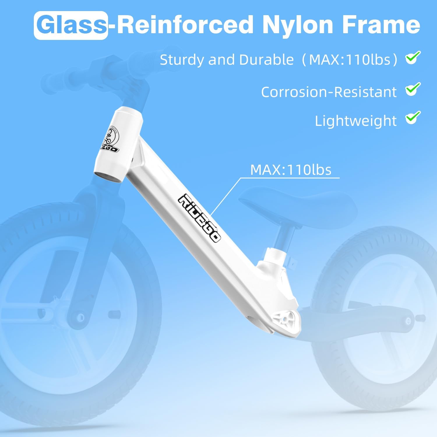 - 【LIGHTWEIGHT & DURABLE FRAME】 Built with a glass-reinforced nylon frame, this kids balance bike 3+ year old matches the strength of carbon steel, supporting up to 110 lbs while weighing only 7.06 lbs. The corrosion-resistant frame prevents rust, ensuring durability. Lightweight and easy to handle, it's perfect for kids to ride and parents to carry.