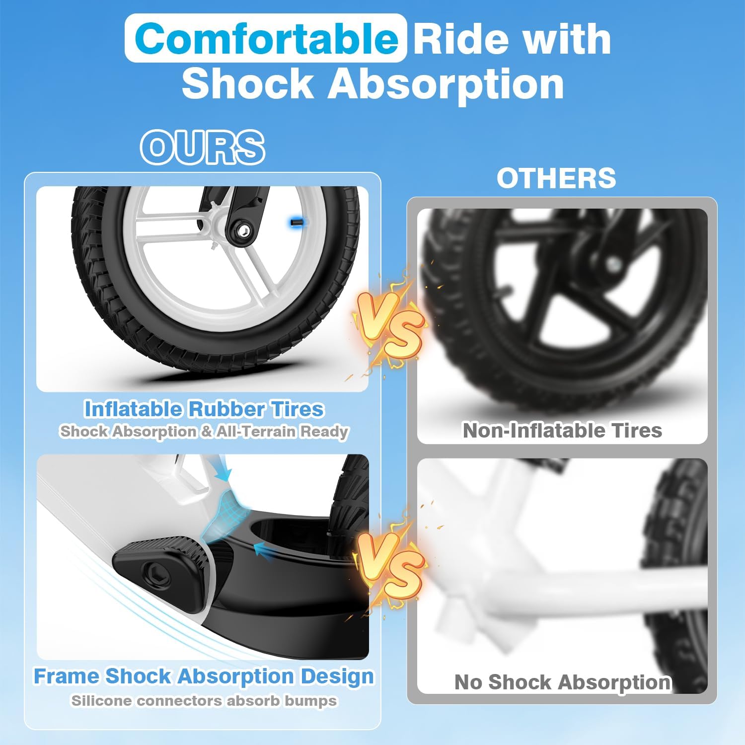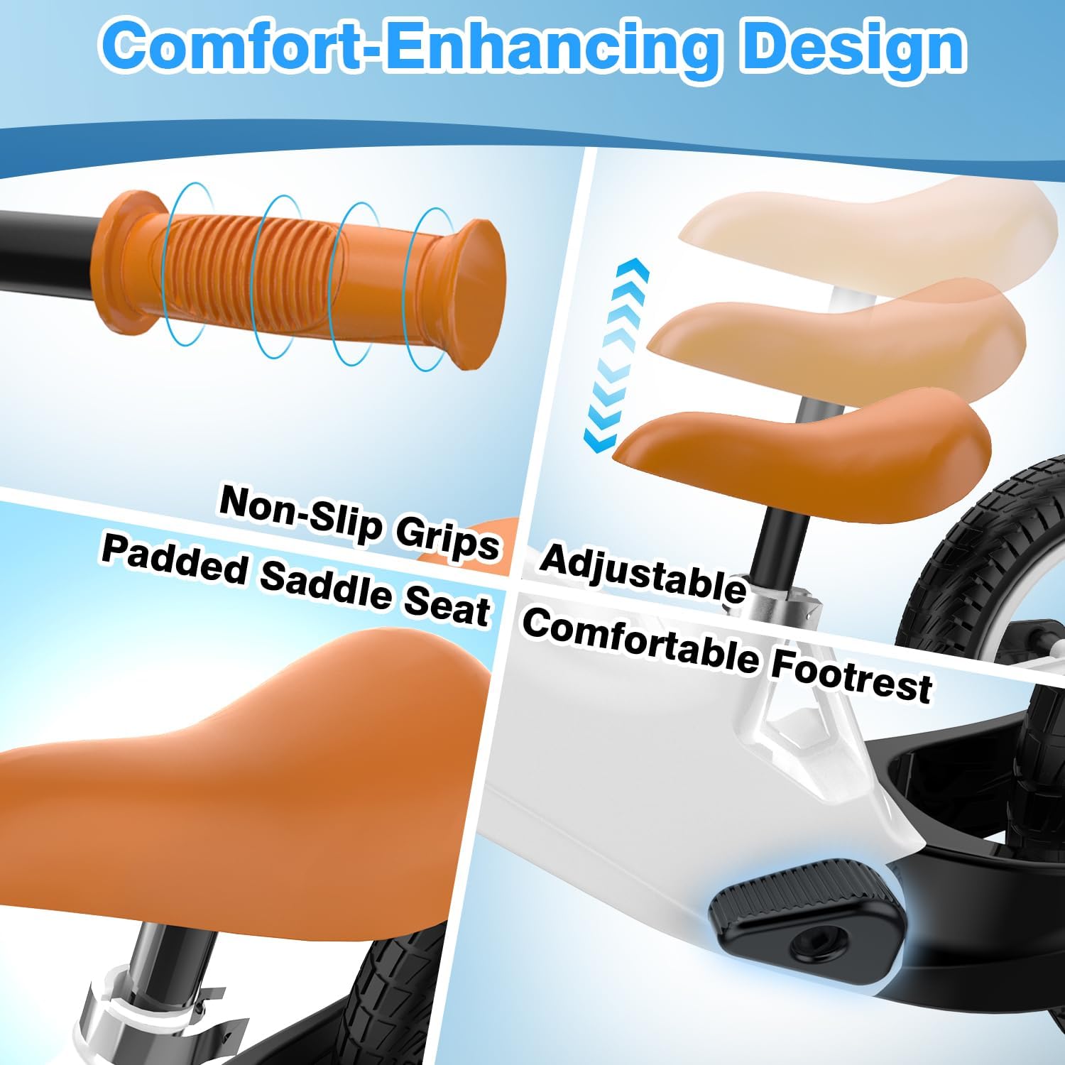 - 【THOUGHTFUL DESIGN FOR COMFORT】Featuring an adjustable seat height (12.2"–16.9") to grow with your child, a soft padded saddle, a rest footrest, and non-slip handlebars for enhanced control and comfort. Silicone shock-absorbing strips at the frame joints further improve riding stability.