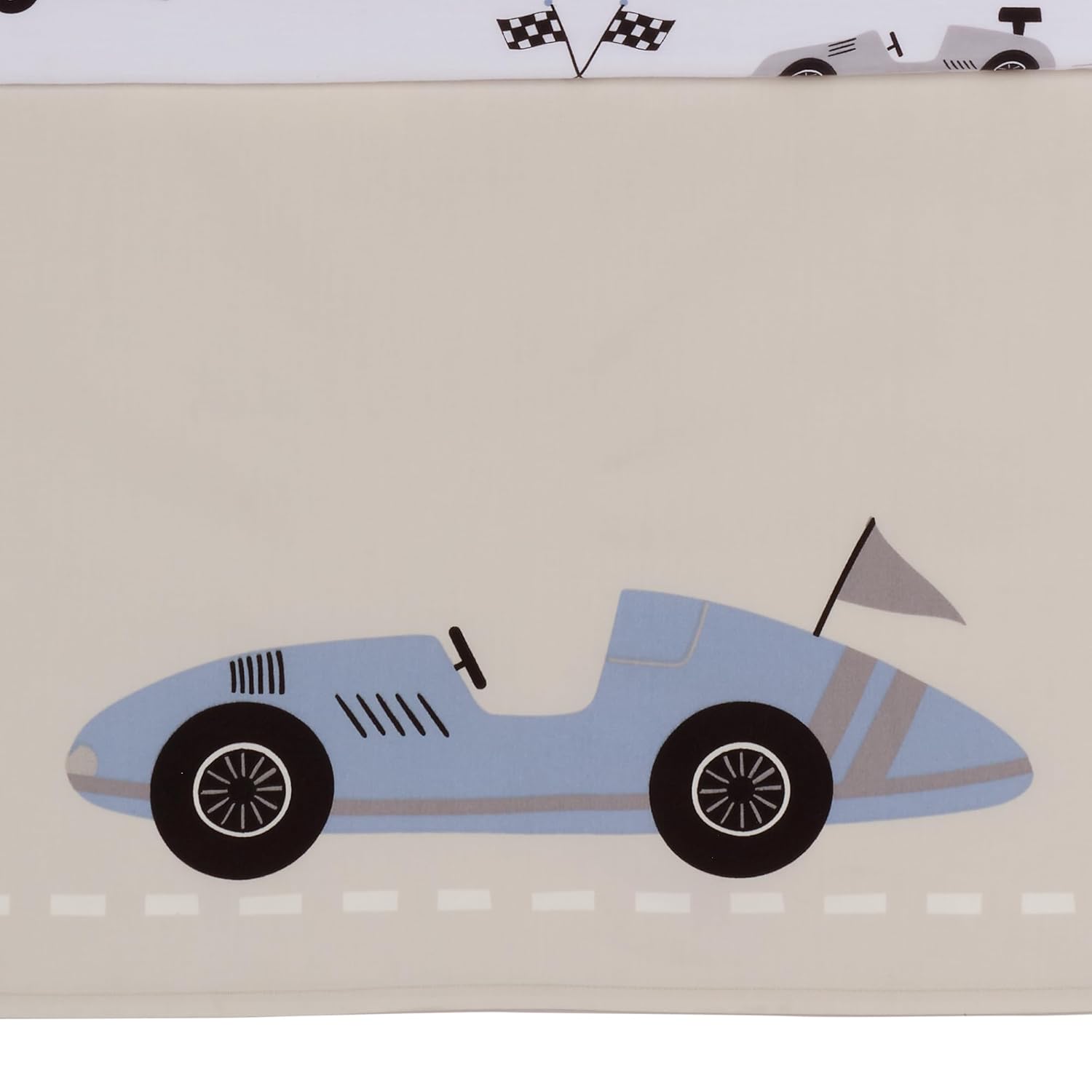 - The crib skirt features multiple colored race cars with black and white checkered flags and has a 14 ½” drop