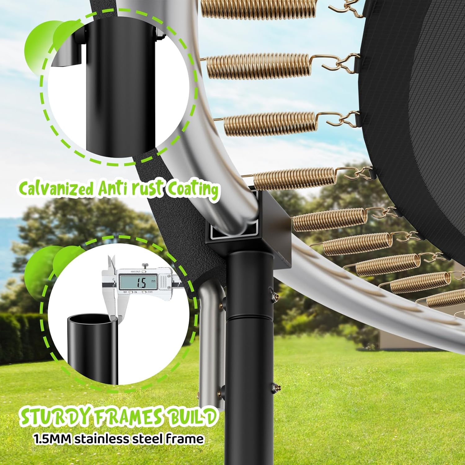 - 【More Durable Trampoline】Our 12 FT trampoline outdoor boasts a durable frame made from weather resistant, rust proof galvanized steel. In addition, the U legs are coated with a premium black protective layer that not only elevates the overall look but also enhances rust resistance and weather durability.
