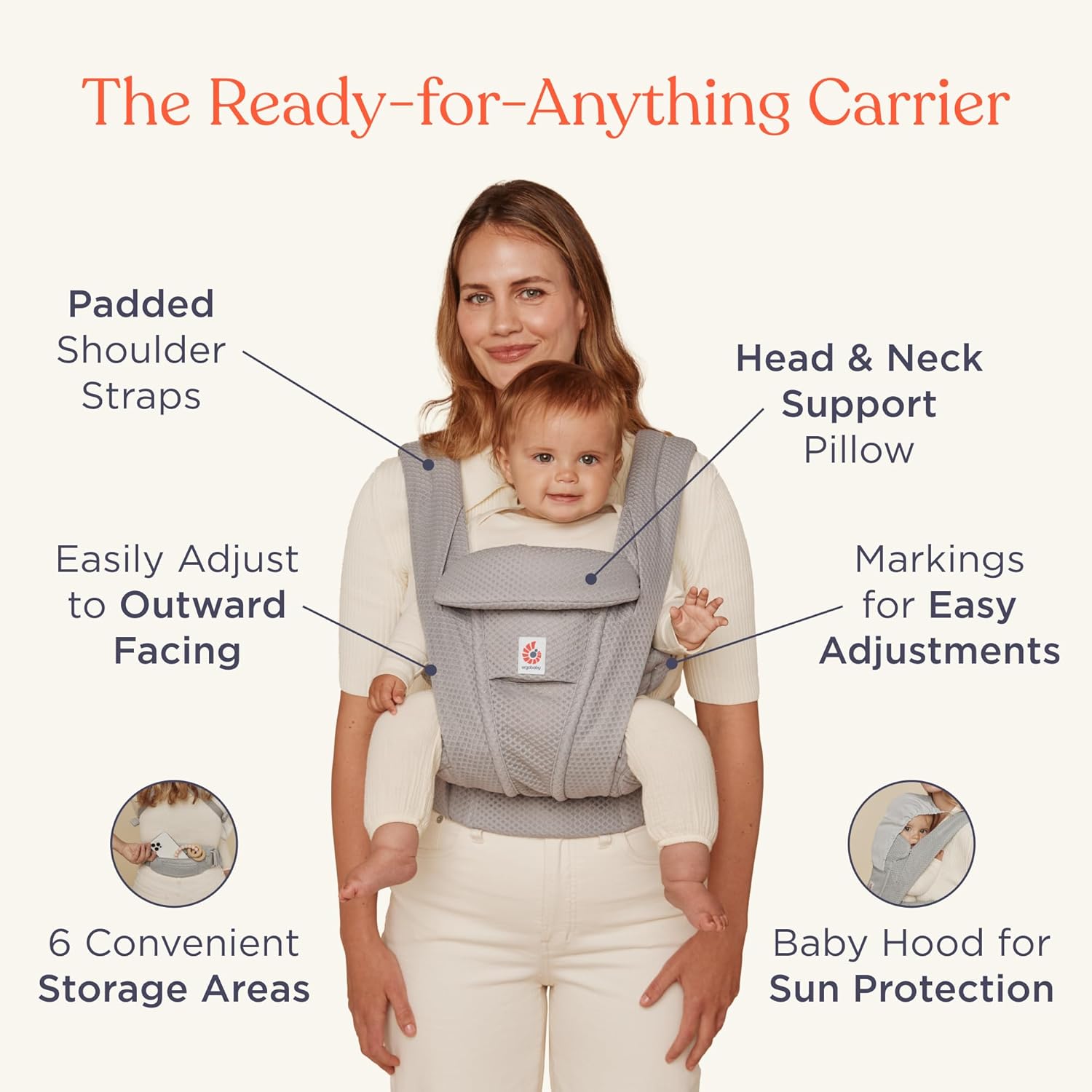 - PREMIUM FEATURES - This baby carrier includes a detachable pouch, built-in hood for sun protection or breastfeeding privacy, and an adjustable head support pillow. It’s everything you need in a premium baby carrier with hip seat-level comfort.