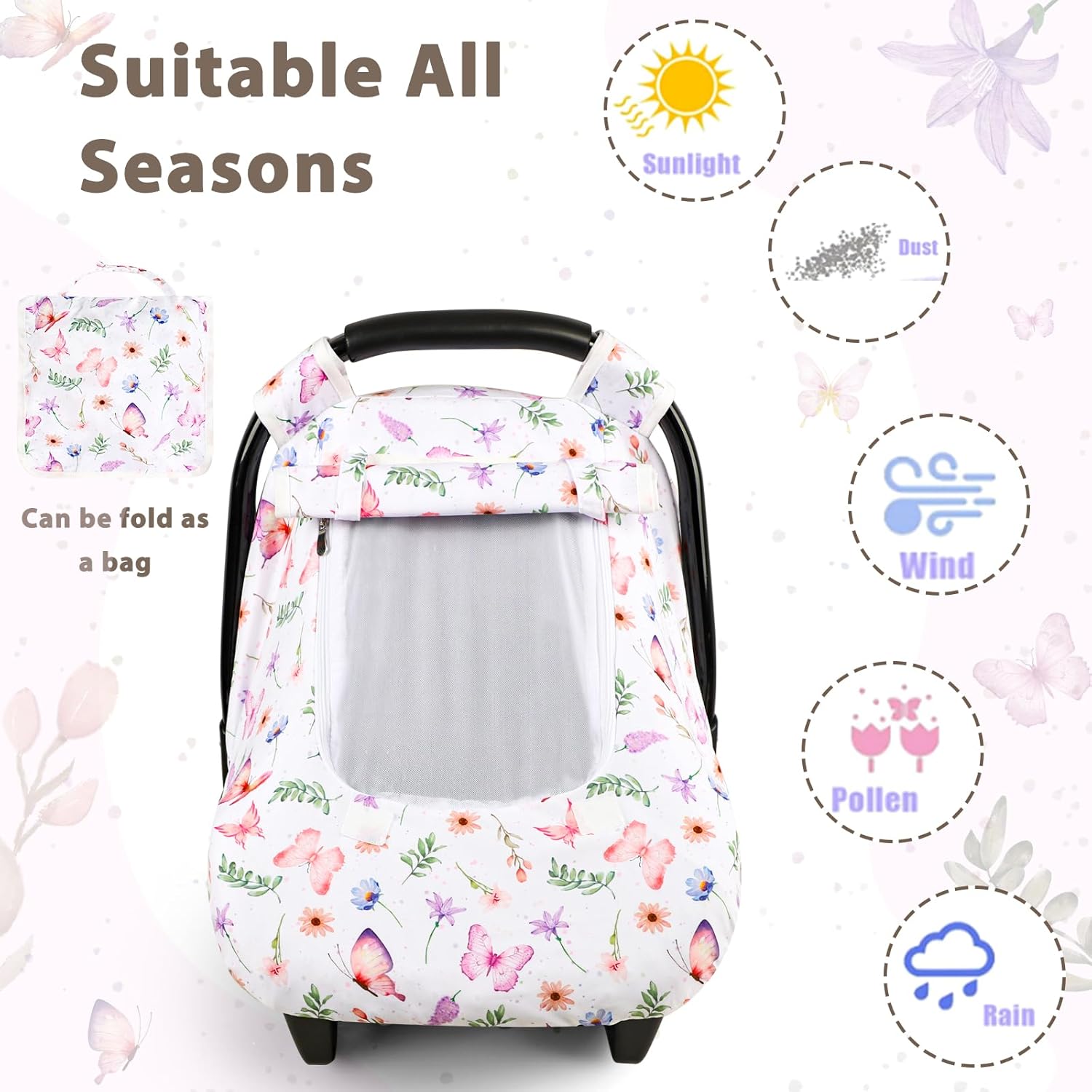 Pea Pod Car Seat Cover Baby, Infant Car Seat Canopy Covers with 2 Layers Windows of Breathable Mesh Fabric, Lightweight Polyester, Soft Minky Dot Backing (Butterfly Pattern)