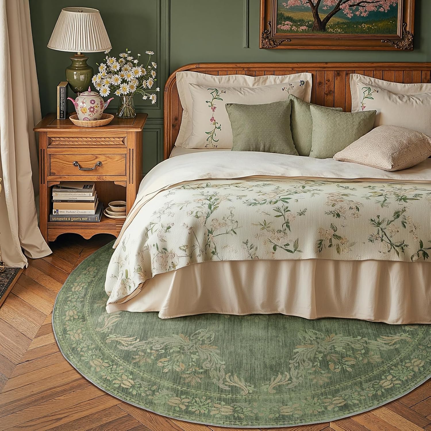 jinchan Round Rug 6ft Area Rugs Vintage Floral Distressed Design,Machine Washable Soft Non-Slip Low-Pile Ultra-Thin Circle Rug for Bedside Living Room Dining Room Bedroom (6' Round, Dark Green)