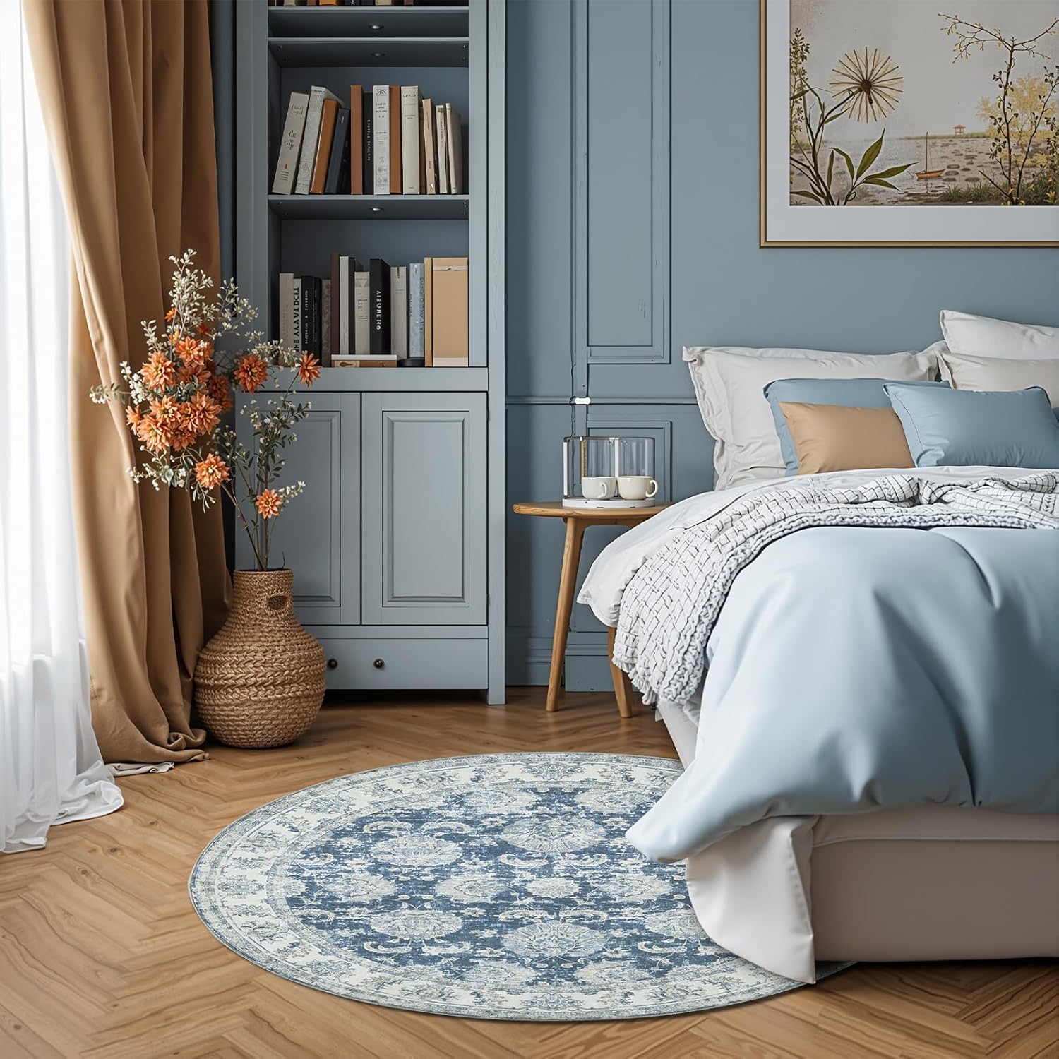 jinchan Round Rug 4ft Area Rug - Indoor Vintage Hallway Circle 4' Washable - Ultra-Thin Low Pile Soft Small Non Slip Distressed Floral Print for Living Room Dining Room Bedroom Entryway Dark Blue