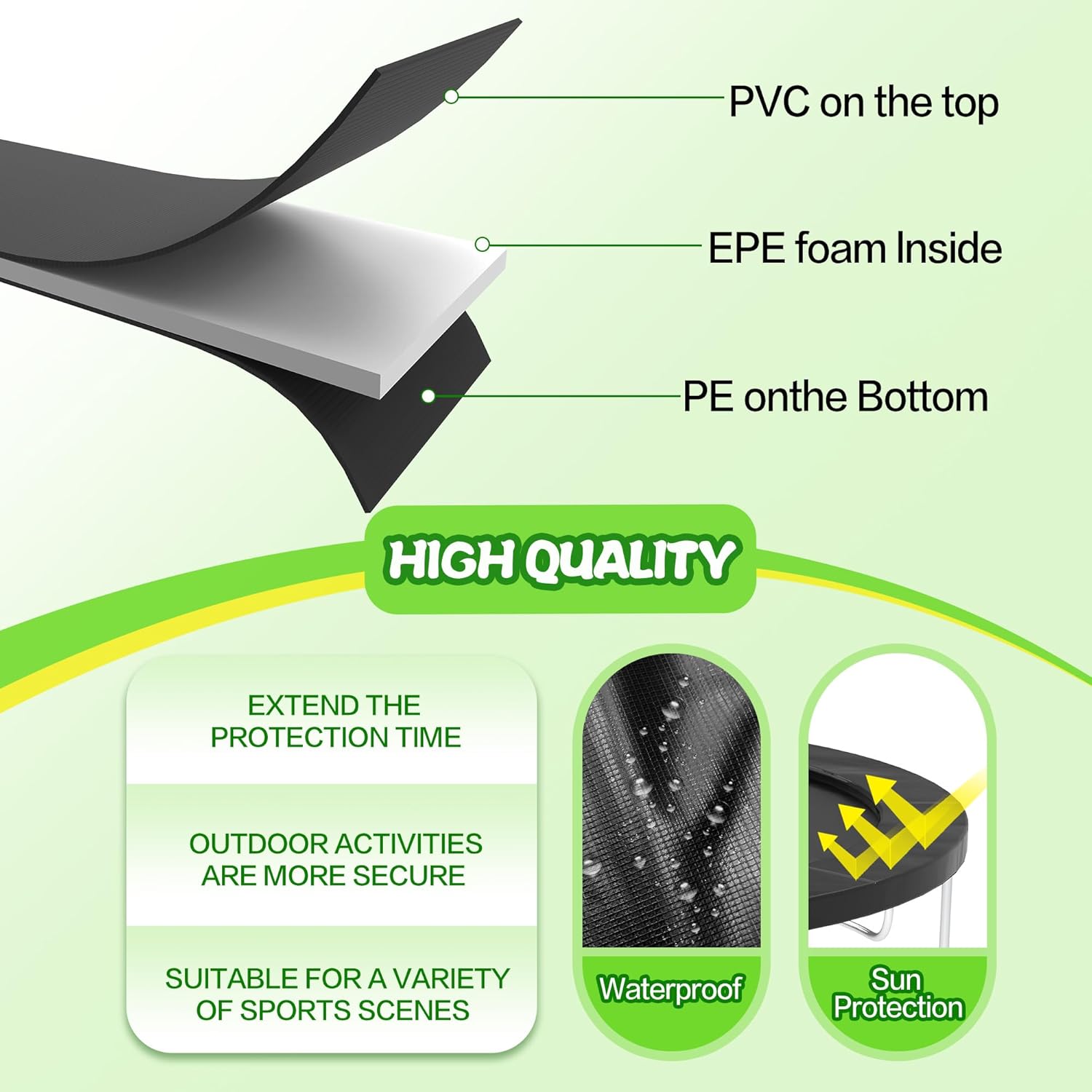 - [Safety Protection] Deomod 12 foot Trampoline Mattress covers the exposed trampoline spring to provide effective cushioning for the user. The soft and thick EPE closed-cell foam protects your children and family from injury. As a result, the user's safety and bouncing experience can be effectively guaranteed. trampoline cover 12 ft is a great trampoline parts option for users who need to replace their 12ft trampoline covers