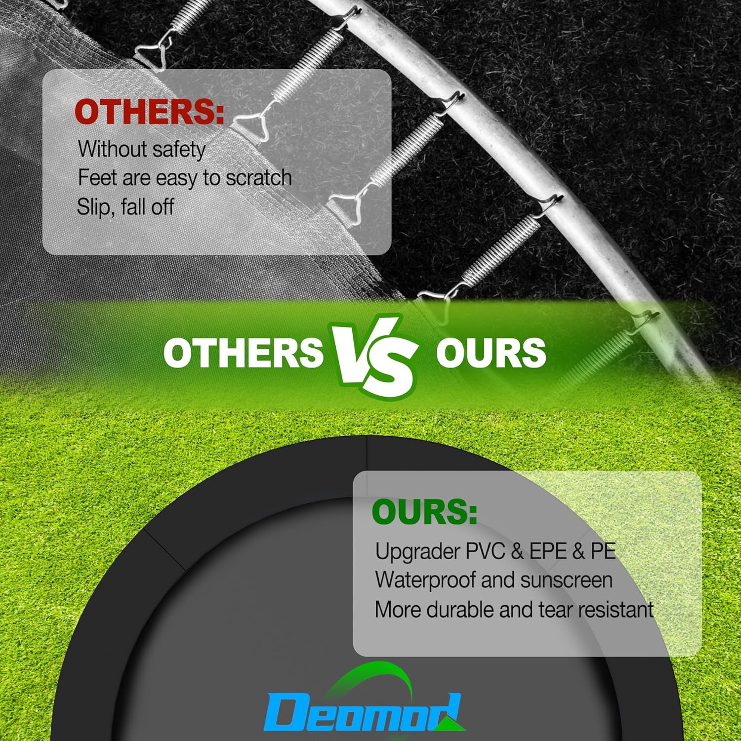 - [Upgraded Disconnect Interface] Deomod trampoline pads has been upgraded on the basis of the old product, adopting the disconnect interface design, which makes the installation more convenient and quicker, trampoline padding replacement can be installed without removing the trampoline net and mat, which saves time and labor