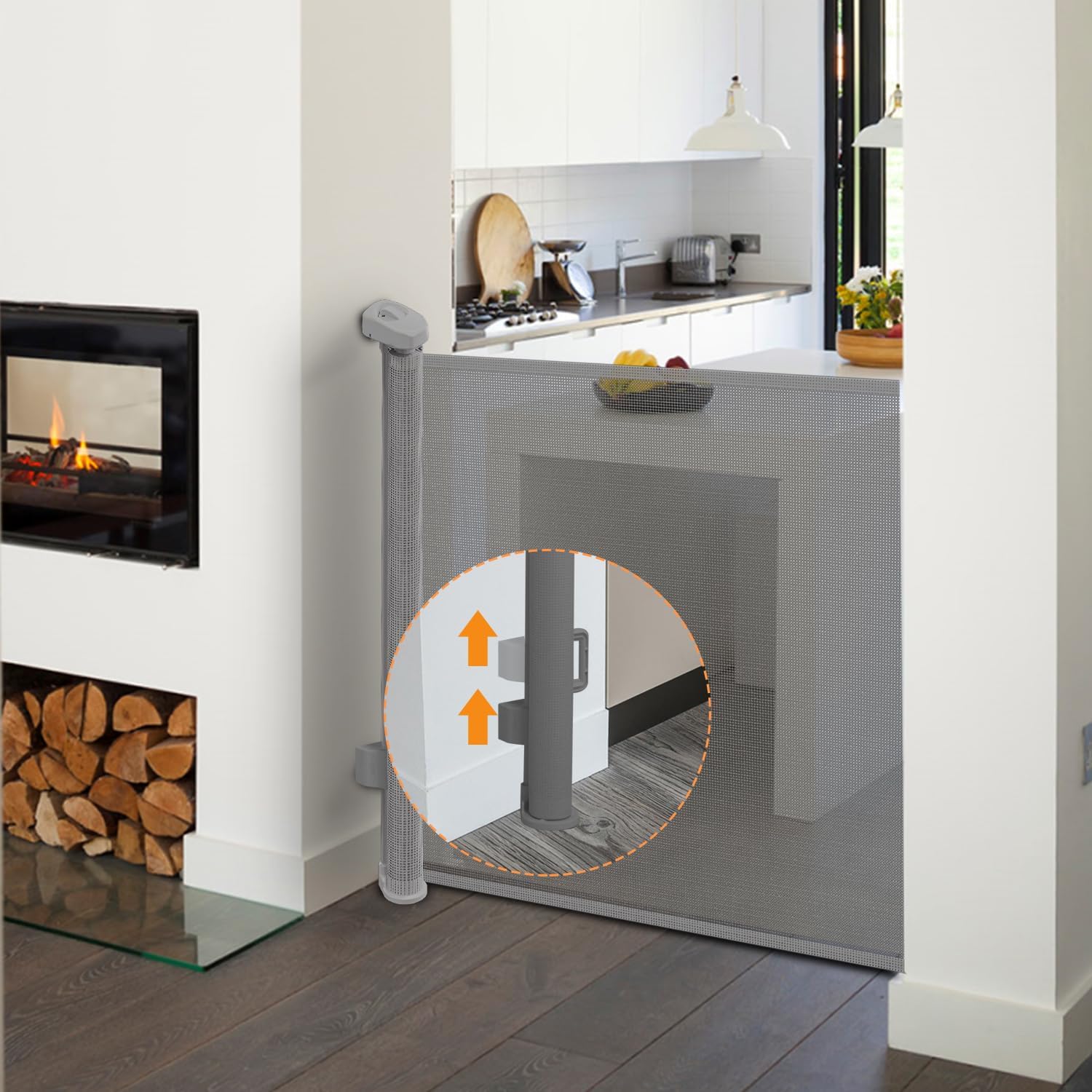 - 【Durable Construction, Safe to Use】This retractable door is made of sturdy and soft mesh design, which prevents our babies from getting any injuries when they accidentally hit the door. All parts are non-toxic and odourless, all door cords are tested for safety standards and meet pass or exceed EN standard test.
