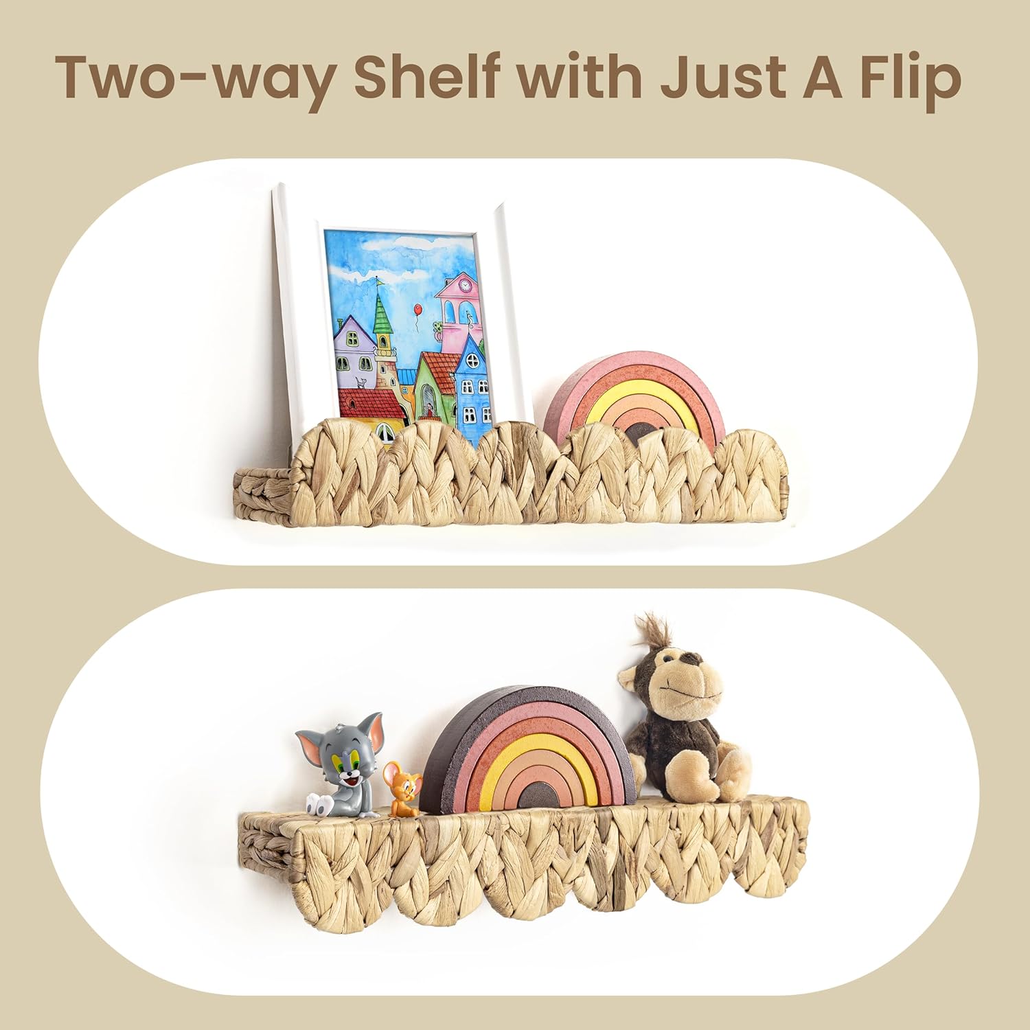 - Versatile & Scalloped Design: Upgrade your child's space with AELS water hyacinth shelves—ideal for lightweight books, toys, and decorative items. Flip them upside down for fresh looks in any room, from nurseries to playrooms. Woven beauties blend style and function.
