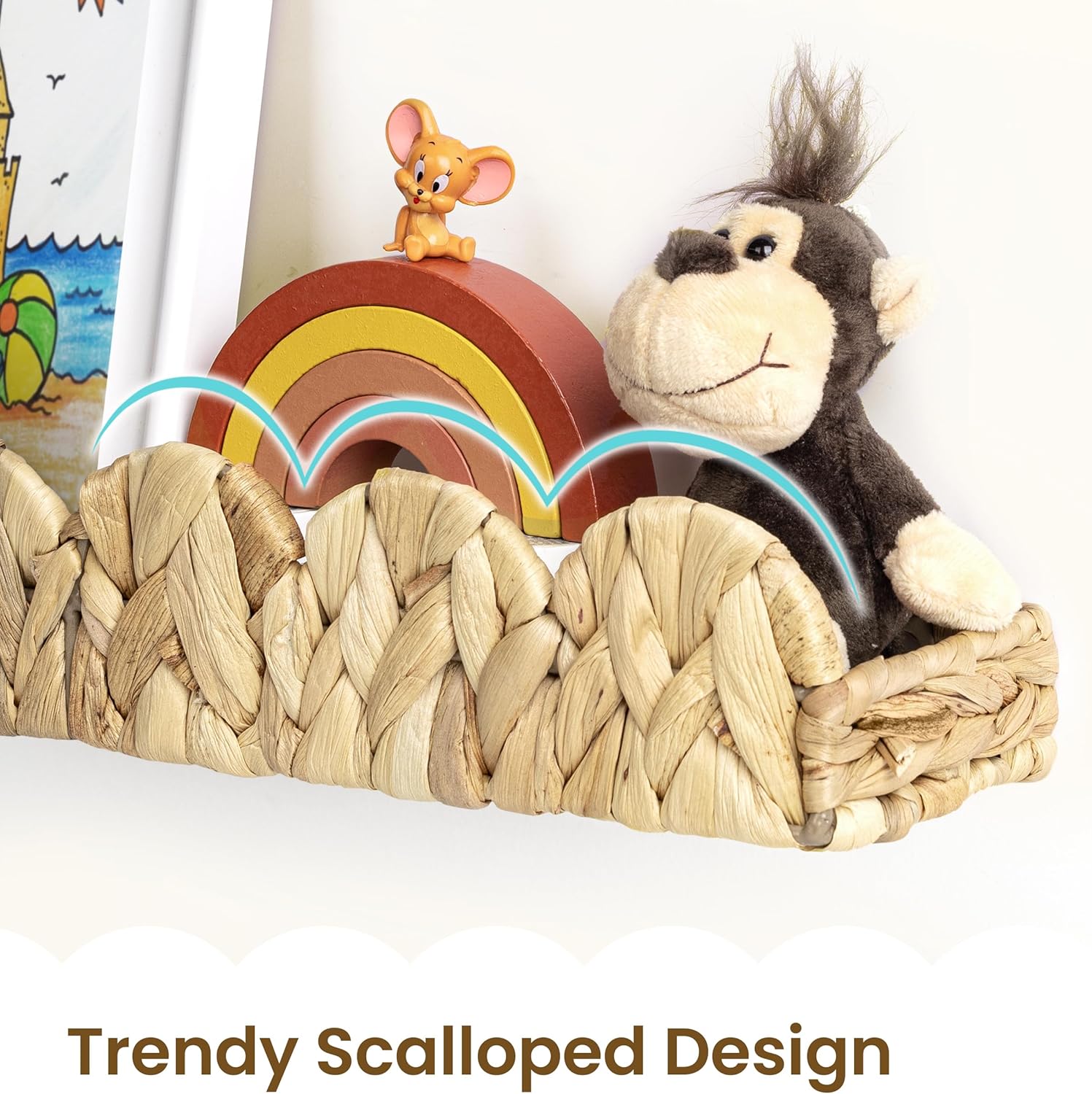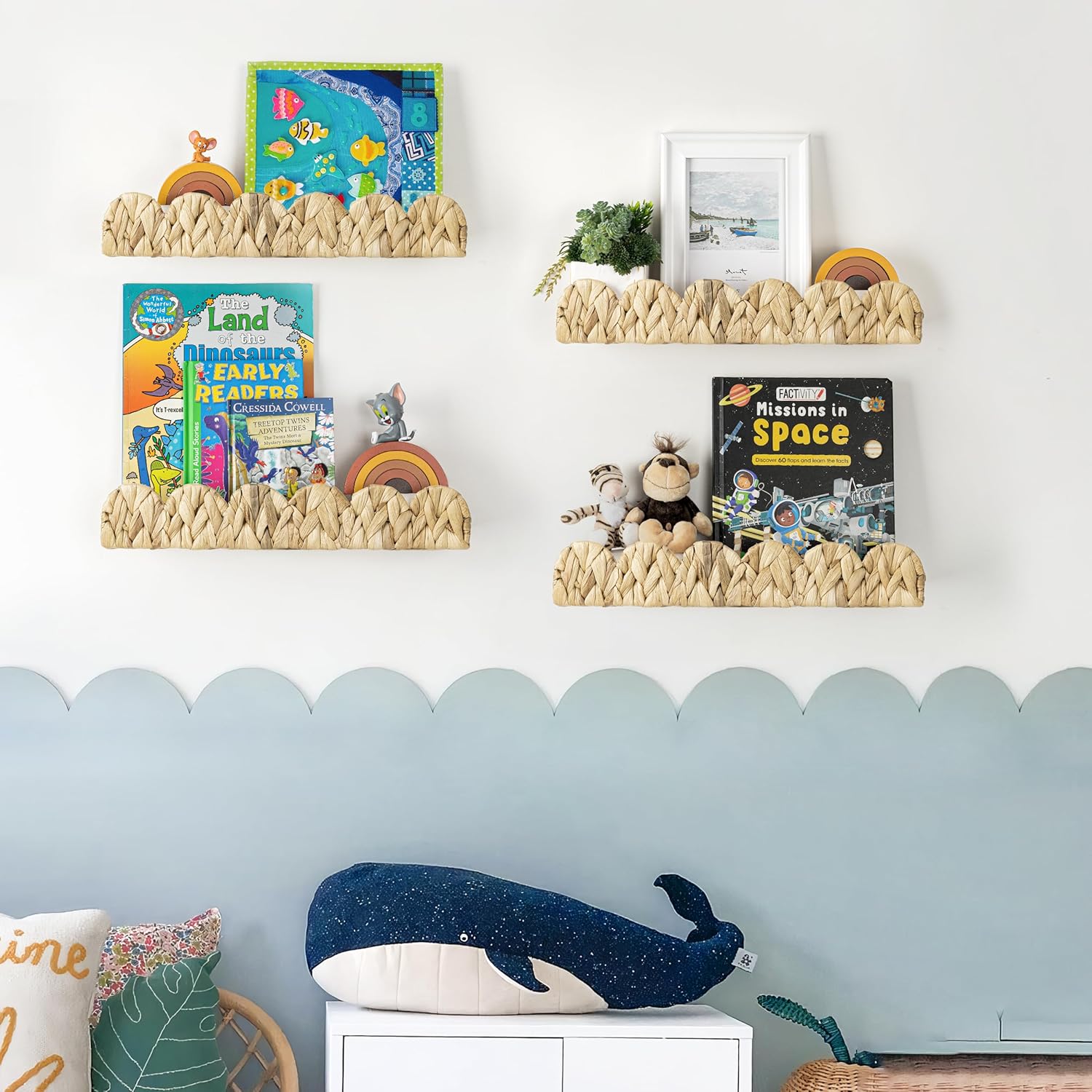 AELS Scalloped Nursery Bookshelf, Set of 4, Picture Ledge Shelf for Wall Decor, Woven Natural Water Hyacinth Floating Shelves for Books, Toys, Photo Frames, Nursery, Boho Modern Farmhouse Book Shelf