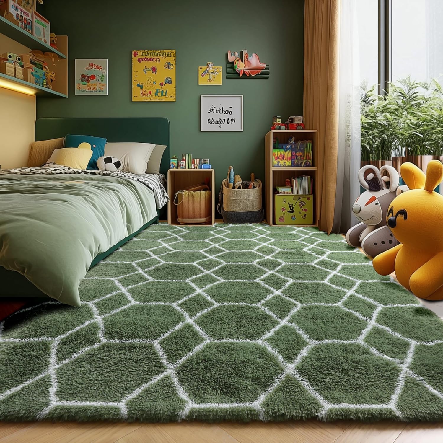 ONASAR 5x7 Area Rugs for Living Room Bedroom, Washable Fluffy Olive Green and White Throw Rug, Geometric Boho Soft Plush Shaggy Floor Carpet for Nursery Kids Girls Boys Teen Dorm Home Decor