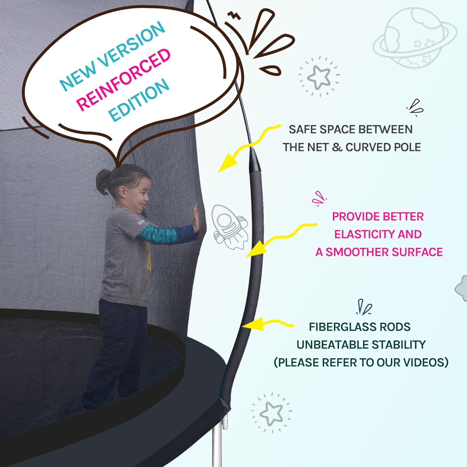 - [ Patented Bungee Cords, NO SPRINGS! ]: Our 6 foot trampolines uses flexible bungee cords instead of metal springs removes any pinch points that might trap feet or toes, reducing the risk of injury.