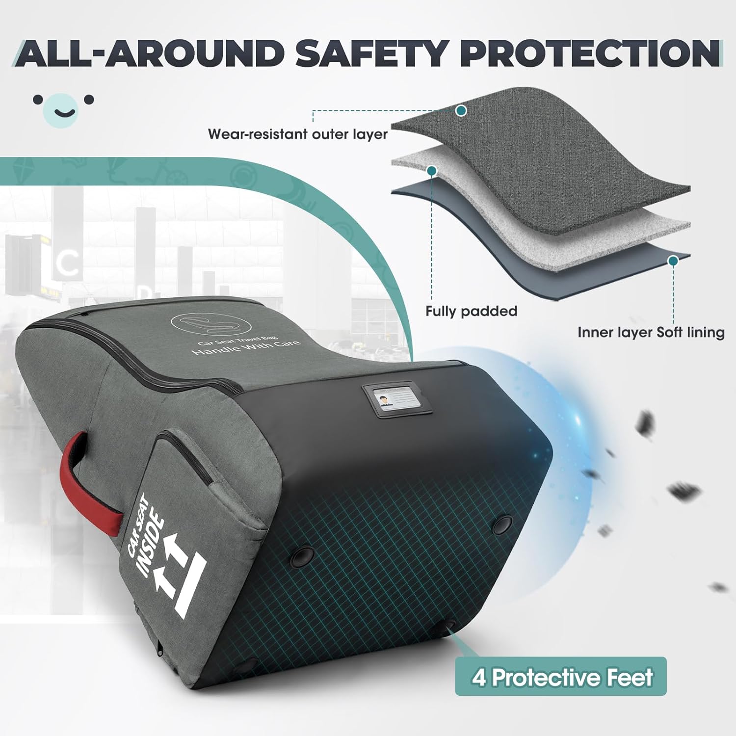 - Safety Protection Design: This car seat travel bag features thick, padded inner side wings and inner fixing straps that securely hold the infant car seat in place, ensuring optimal protection for convertible car seats. Dual lockable zipper opening improves safety. Moreover, with 4 thick feet on the bottom, the padded car seat travel bag provides complete scratch protection.